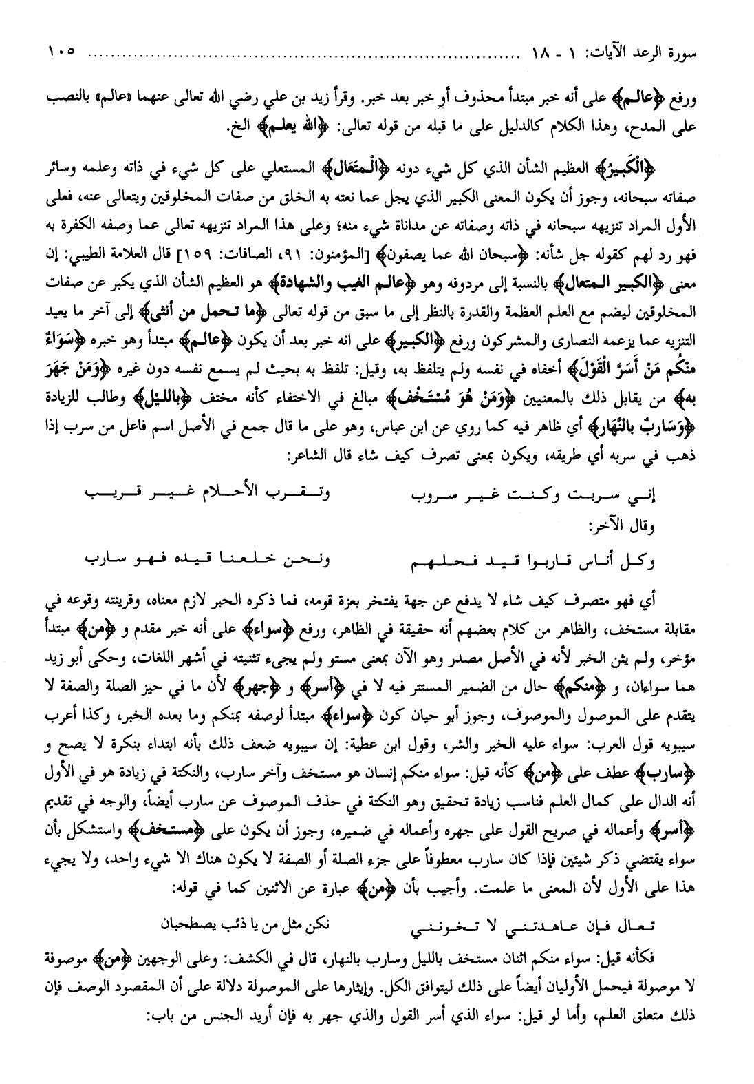 هو العظيم الشأن الذي يكبر عن صفات المخلوقين ليضم مع العلم العظمة والقدرة بالنظر إلى ما سبق من قوله تعالى ما تَحْمِلُ مِنْ أُنْثى إلى آخر ما يعيد التنزيه عما يزعمه النصارى والمشركون ورفع الْكَبِيرُ على انه خبر بعد أن يكون عالِمُ مبتدأ وهو خبره سَواءٌ مِنْكُمْ مَنْ أَسَرَّ الْقَوْلَ أخفاه في نفسه ولم يتلفظ به، وقيل: تلفظ به بحيث لم يسمع نفسه دون غيره وَمَنْ جَهَرَ بِهِ من يقابل ذلك بالمعنيين وَمَنْ هُوَ مُسْتَخْفٍ مبالغ في الاختفاء كأنه مختف بِاللَّيْلِ وطالب للزيادة وَسارِبٌ بِالنَّهارِ أي ظاهر فيه كما روي عن ابن عباس، وهو على ما قال جمع في الأصل اسم فاعل من سرب إذا ذهب في سربه أي طريقه، ويكون بمعنى تصرف كيف شاء قال الشاعر: