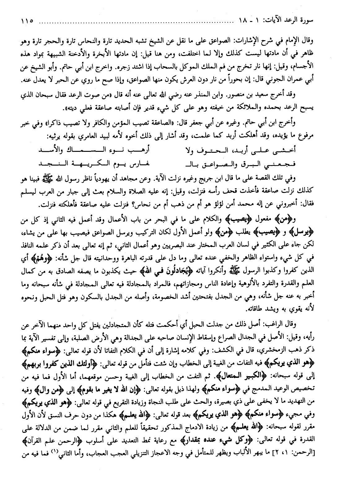 وقال الراغب: أصل ذلك من جدلت الحبل أي أحكمت فتله كأن المتجادلين يفتل كل واحد منهما الآخر عن رأيه، وقيل: الأصل في الجدال الصراع وإسقاط الإنسان صاحبه على الجدالة وهي الأرض الصلبة، وإلى تفسير الآية بما ذكر ذهب الزمخشري، قال في الكشف: وفي كلامه إشارة إلى أن في الكلام التفاتا لأن قوله تعالى: سَواءٌ مِنْكُمْ هُوَ الَّذِي يُرِيكُمُ فيه التفات من الغيبة إلى الخطاب وإن شئت فتأمل من قوله تعالى: أُولئِكَ الَّذِينَ كَفَرُوا بِرَبِّهِمْ إلى قوله سبحانه: الْكَبِيرُ الْمُتَعالِ. ثم التفت من الخطاب إلى الغيبة وحسن موقعهما، أما الأول فما فيه من تخصيص الوعيد المدمج في سَواءٌ مِنْكُمْ ولهذا ذيل بقوله تعالى: إِنَّ اللَّهَ لا يُغَيِّرُ ما بِقَوْمٍ إلى مِنْ والٍ وفيه من التهديد ما لا يخفى على ذي بصيرة، والحث على طلب النجاة وزيادة التقريع في قوله تعالى: هُوَ الَّذِي يُرِيكُمُ وفي مجيء سَواءٌ مِنْكُمْ هُوَ الَّذِي يُرِيكُمُ بعد قوله تعالى: اللَّهُ يَعْلَمُ هكذا من دون حرف النسق لأن الأول مقرر لقوله سبحانه: اللَّهُ يَعْلَمُ من زيادة الادماج المذكور تحقيقا للعلم والثاني مقرر لما ضمن من الدلالة على القدرة في قوله تعالى: وَكُلُّ شَيْءٍ عِنْدَهُ بِمِقْدارٍ مع رعاية نمط التعديد على أسلوب الرَّحْمنُ عَلَّمَ الْقُرْآنَ [الرحمن: 1، 2] ما يبهر الألباب ويظهر للمتأمل في وجه الاعجاز التنزيلي العجب العجاب، وأما الثاني فما فيه من
