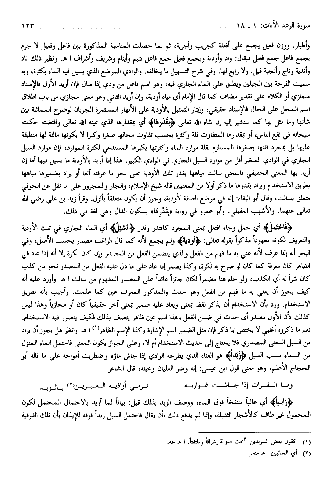 اه. وانظر هل يجوز أن يراد من السيل المعنى المصدري فلا يحتاج إلى حديث الاستخدام أم لا، وعلى الجواز يكون المعنى فاحتمل الماء المنزل من السماء بسبب السيل زَبَداً هو الغثاء الذي يطرحه الوادي إذا جاش ماؤه واضطربت أمواجه على ما قاله أبو الحجاج الأعلم، وهو معنى قول ابن عيسى: إنه وضر الغليان وخبثه، قال الشاعر: