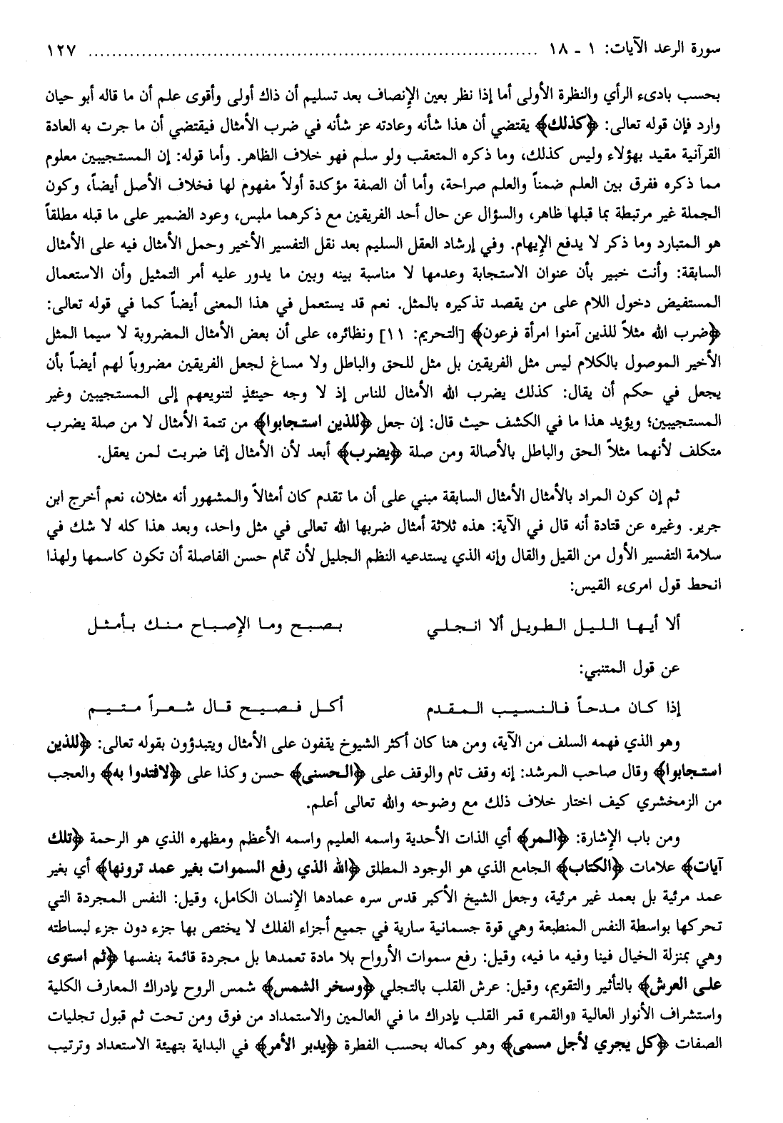 ومن باب الإشارة: المر أي الذات الأحدية واسمه العليم واسمه الأعظم ومظهره الذي هو الرحمة تِلْكَ آياتُ علامات الْكِتابِ الجامع الذي هو الوجود المطلق اللَّهُ الَّذِي رَفَعَ السَّماواتِ بِغَيْرِ عَمَدٍ تَرَوْنَها أي بغير عمد مرئية بل بعمد غير مرئية، وجعل الشيخ الأكبر قدس سره عمادها الإنسان الكامل، وقيل: النفس المجردة التي تحركها بواسطة النفس المنطبعة وهي قوة جسمانية سارية في جميع أجزاء الفلك لا يختص بها جزء دون جزء لبساطته وهي بمنزلة الخيال فينا وفيه ما فيه، وقيل: رفع سموات الأرواح بلا مادة تعمدها بل مجردة قائمة بنفسها ثُمَّ اسْتَوى عَلَى الْعَرْشِ بالتأثير والتقويم، وقيل: عرش القلب بالتجلي وَسَخَّرَ الشَّمْسَ شمس الروح بإدراك المعارف الكلية واستشراف الأنوار العالية «والقمر» قمر القلب بإدراك ما في العالمين والاستمداد من فوق ومن تحت ثم قبول تجليات الصفات كُلٌّ يَجْرِي لِأَجَلٍ مُسَمًّى وهو كماله بحسب الفطرة يُدَبِّرُ الْأَمْرَ في البداية بتهيئة الاستعداد وترتيب