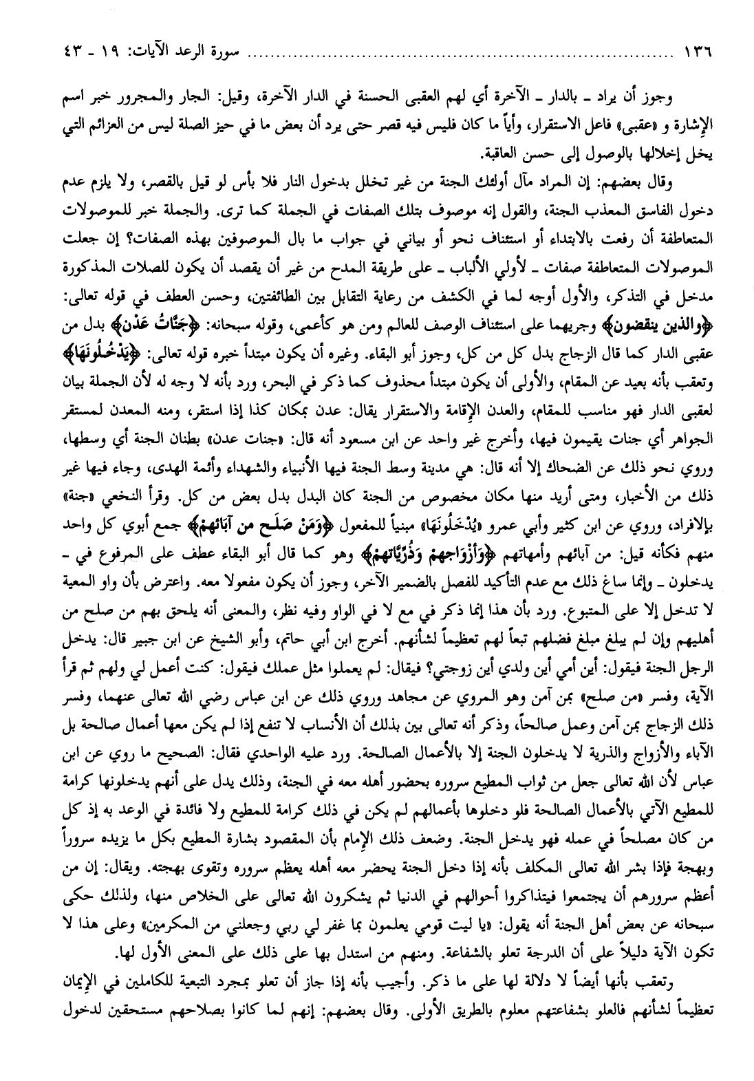 وَالَّذِينَ يَنْقُضُونَ وجريهما على استئناف الوصف للعالم ومن هو كأعمى، وقوله سبحانه: جَنَّاتُ عَدْنٍ بدل من عقبى الدار كما قال الزجاج بدل كل من كل، وجوز أبو البقاء. وغيره أن يكون مبتدأ خبره قوله تعالى: يَدْخُلُونَها وتعقب بأنه بعيد عن المقام، والأولى أن يكون مبتدأ محذوف كما ذكر في البحر، ورد بأنه لا وجه له لأن الجملة بيان لعقبى الدار فهو مناسب للمقام، والعدن الإقامة والاستقرار يقال: عدن بمكان كذا إذا استقر، ومنه المعدن لمستقر الجواهر أي جنات يقيمون فيها، وأخرج غير واحد عن ابن مسعود أنه قال: «جنات عدن» بطنان الجنة أي وسطها، وروي نحو ذلك عن الضحاك إلا أنه قال: هي مدينة وسط الجنة فيها الأنبياء والشهداء وأئمة الهدى، وجاء فيها غير ذلك من الأخبار، ومتى أريد منها مكان مخصوص من الجنة كان البدل بدل بعض من كل. وقرأ النخعي «جنة» بالإفراد، وروي عن ابن كثير وأبي عمرو «يدخلونها» مبنيا للمفعول وَمَنْ صَلَحَ مِنْ آبائِهِمْ جمع أبوي كل واحد منهم فكأنه قيل: من آبائهم وأمهاتهم وَأَزْواجِهِمْ وَذُرِّيَّاتِهِمْ وهو كما قال أبو البقاء عطف على المرفوع في- يدخلون- وإنما ساغ ذلك مع عدم التأكيد للفصل بالضمير الآخر، وجوز أن يكون مفعولا معه. واعترض بأن واو المعية لا تدخل إلا على المتبوع. ورد بأن هذا إنما ذكر في مع لا في الواو وفيه نظر، والمعنى أنه يلحق بهم من صلح من أهليهم وإن لم يبلغ مبلغ فضلهم تبعا لهم تعظيما لشأنهم. أخرج ابن أبي حاتم، وأبو الشيخ عن ابن جبير قال: يدخل الرجل الجنة فيقول: أين أمي أين ولدي أين زوجتي؟ فيقال: لم يعملوا مثل عملك فيقول: كنت أعمل لي ولهم ثم قرأ الآية، وفسر «من صلح» بمن آمن وهو المروي عن مجاهد وروي ذلك عن ابن عباس رضي الله تعالى عنهما، وفسر ذلك الزجاج بمن آمن وعمل صالحا، وذكر أنه تعالى بين بذلك أن الأنساب لا تنفع إذا لم يكن معها أعمال صالحة بل الآباء والأزواج والذرية لا يدخلون الجنة إلا بالأعمال الصالحة. ورد عليه الواحدي فقال: الصحيح ما روي عن ابن عباس لأن الله تعالى جعل من ثواب المطيع سروره بحضور أهله معه في الجنة، وذلك يدل على أنهم يدخلونها كرامة للمطيع الآتي بالأعمال الصالحة فلو دخلوها بأعمالهم لم يكن في ذلك كرامة للمطيع ولا فائدة في الوعد به إذ كل من كان مصلحا في عمله فهو يدخل الجنة. وضعف ذلك الإمام بأن المقصود بشارة المطيع بكل ما يزيده سرورا وبهجة فإذا بشر الله تعالى المكلف بأنه إذا دخل الجنة يحضر معه أهله يعظم سروره وتقوى بهجته. ويقال: إن من أعظم سرورهم أن يجتمعوا فيتذاكروا أحوالهم في الدنيا ثم يشكرون الله تعالى على الخلاص منها، ولذلك حكى سبحانه عن بعض أهل الجنة أنه يقول: «يا ليت قومي يعلمون بما غفر لي ربي وجعلني من المكرمين» وعلى هذا لا تكون الآية دليلا على أن الدرجة تعلو بالشفاعة. ومنهم من استدل بها على ذلك على المعنى الأول لها.