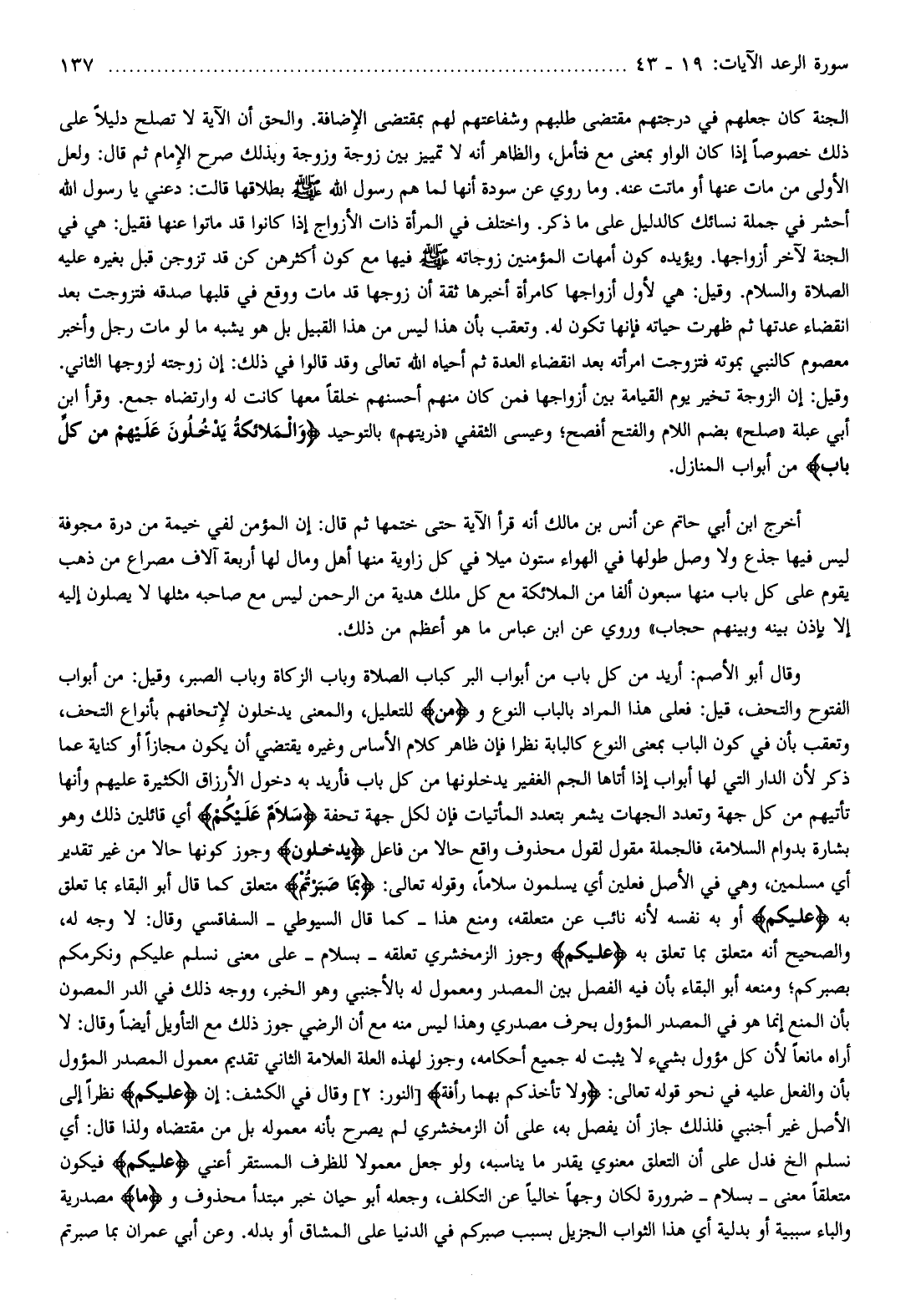 وقال أبو الأصم: أريد من كل باب من أبواب البر كباب الصلاة وباب الزكاة وباب الصبر، وقيل: من أبواب الفتوح والتحف، قيل: فعلى هذا المراد بالباب النوع ومَنْ للتعليل، والمعنى يدخلون لإتحافهم بأنواع التحف، وتعقب بأن في كون الباب بمعنى النوع كالبابة نظرا فإن ظاهر كلام الأساس وغيره يقتضي أن يكون مجازا أو كناية عما ذكر لأن الدار التي لها أبواب إذا أتاها الجم الغفير يدخلونها من كل باب فأريد به دخول الأرزاق الكثيرة عليهم وأنها تأتيهم من كل جهة وتعدد الجهات يشعر بتعدد المأتيات فإن لكل جهة تحفة سَلامٌ عَلَيْكُمْ أي قائلين ذلك وهو بشارة بدوام السلامة، فالجملة مقول لقول محذوف واقع حالا من فاعل يَدْخُلُونَ وجوز كونها حالا من غير تقدير أي مسلمين، وهي في الأصل فعلين أي يسلمون سلاما، وقوله تعالى: بِما صَبَرْتُمْ متعلق كما قال أبو البقاء بما تعلق به عَلَيْكُمْ أو به نفسه لأنه نائب عن متعلقه، ومنع هذا- كما قال السيوطي- السفاقسي وقال: لا وجه له، والصحيح أنه متعلق بما تعلق به عَلَيْكُمْ وجوز الزمخشري تعلقه- بسلام- على معنى نسلم عليكم ونكرمكم بصبركم ومنعه أبو البقاء بأن فيه الفصل بين المصدر ومعمول له بالأجنبي وهو الخبر، ووجه ذلك في الدر المصون بأن المنع إنما هو في المصدر المؤول بحرف مصدري وهذا ليس منه مع أن الرضي جوز ذلك مع التأويل أيضا وقال: لا أراه مانعا لأن كل مؤول بشيء لا يثبت له جميع أحكامه، وجوز لهذه العلة العلامة الثاني تقديم معمول المصدر المؤول بأن والفعل عليه في نحو قوله تعالى: وَلا تَأْخُذْكُمْ بِهِما رَأْفَةٌ [النور: 2] وقال في الكشف: إن عَلَيْكُمْ نظرا إلى الأصل غير أجنبي فلذلك جاز أن يفصل به، على أن الزمخشري لم يصرح بأنه معموله بل من مقتضاه ولذا قال: أي نسلم إلخ فدل على أن التعلق معنوي يقدر ما يناسبه، ولو جعل معمولا للظرف المستقر أعني عَلَيْكُمْ فيكون متعلقا معنى- بسلام- ضرورة لكان وجها خاليا عن التكلف، وجعله أبو حيان خبر مبتدأ محذوف وبِما مصدرية والباء سببية أو بدلية أي هذا الثواب الجزيل بسبب صبركم في الدنيا على المشاق أو بدله. وعن أبي عمران بما صبرتم