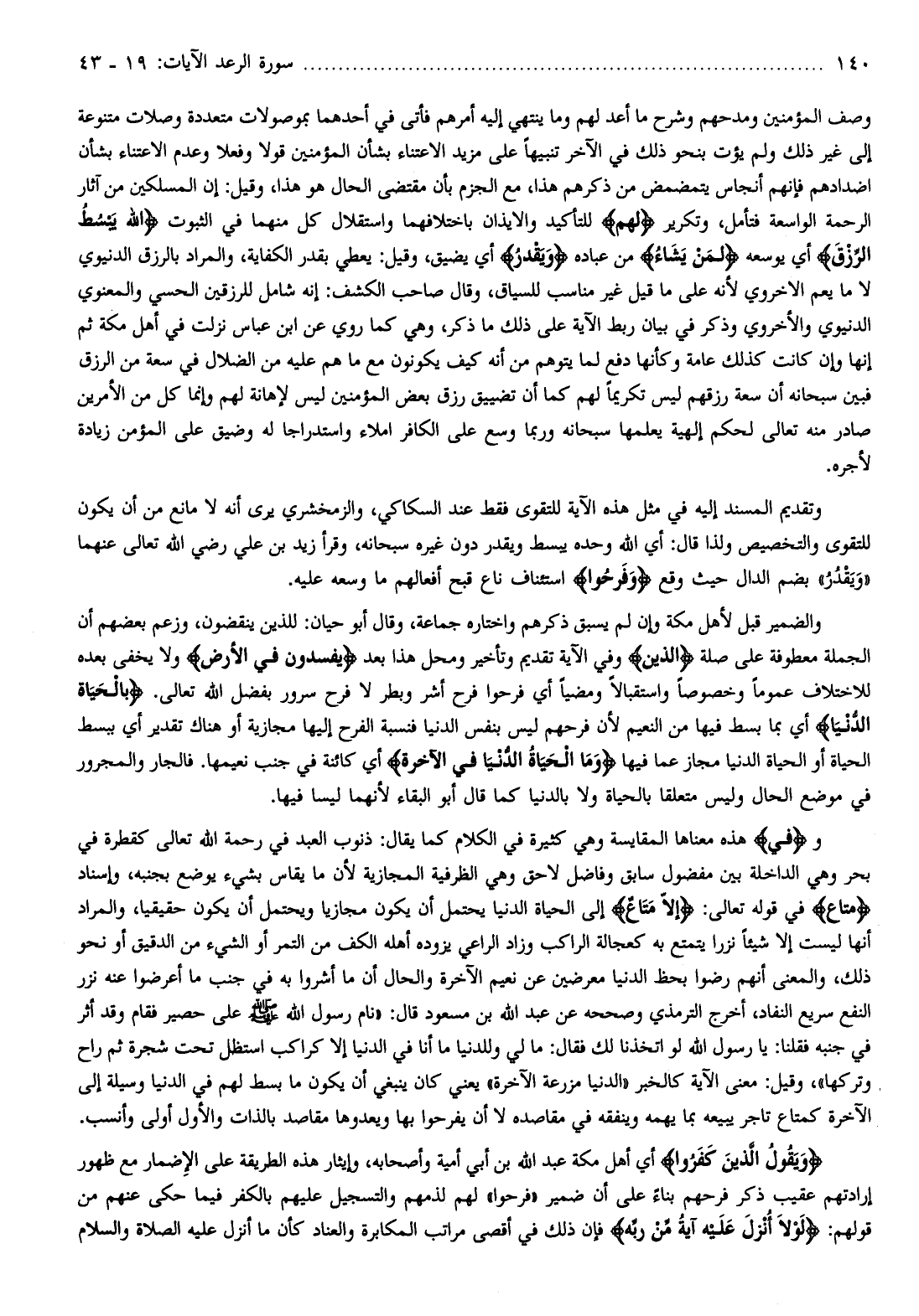 وصف المؤمنين ومدحهم وشرح ما أعد لهم وما ينتهي إليه أمرهم فأتى في أحدهما بموصولات متعددة وصلات متنوعة إلى غير ذلك ولم يؤت بنحو ذلك في الآخر تنبيها على مزيد الاعتناء بشأن المؤمنين قولا وفعلا وعدم الاعتناء بشأن أضدادهم فإنهم أنجاس يتمضمض من ذكرهم هذا، مع الجزم بأن مقتضى الحال هو هذا، وقيل: إن المسلكين من آثار الرحمة الواسعة فتأمل، وتكرير لَهُمُ للتأكيد والإيذان باختلافهما واستقلال كل منهما في الثبوت اللَّهُ يَبْسُطُ الرِّزْقَ أي يوسعه لِمَنْ يَشاءُ من عباده وَيَقْدِرُ أي يضيق، وقيل: يعطي بقدر الكفاية، والمراد بالرزق الدنيوي لا ما يعم الاخروي لأنه على ما قيل غير مناسب للسياق، وقال صاحب الكشف: إنه شامل للرزقين الحسي والمعنوي الدنيوي والأخروي وذكر في بيان ربط الآية على ذلك ما ذكر، وهي كما روي عن ابن عباس نزلت في أهل مكة ثم إنها وإن كانت كذلك عامة وكأنها دفع لما يتوهم من أنه كيف يكونون مع ما هم عليه من الضلال في سعة من الرزق فبين سبحانه أن سعة رزقهم ليس تكريما لهم كما أن تضييق رزق بعض المؤمنين ليس لإهانة لهم وإنما كل من الأمرين صادر منه تعالى لحكم إلهية يعلمها سبحانه وربما وسع على الكافر إملاء واستدراجا له وضيق على المؤمن زيادة لأجره.