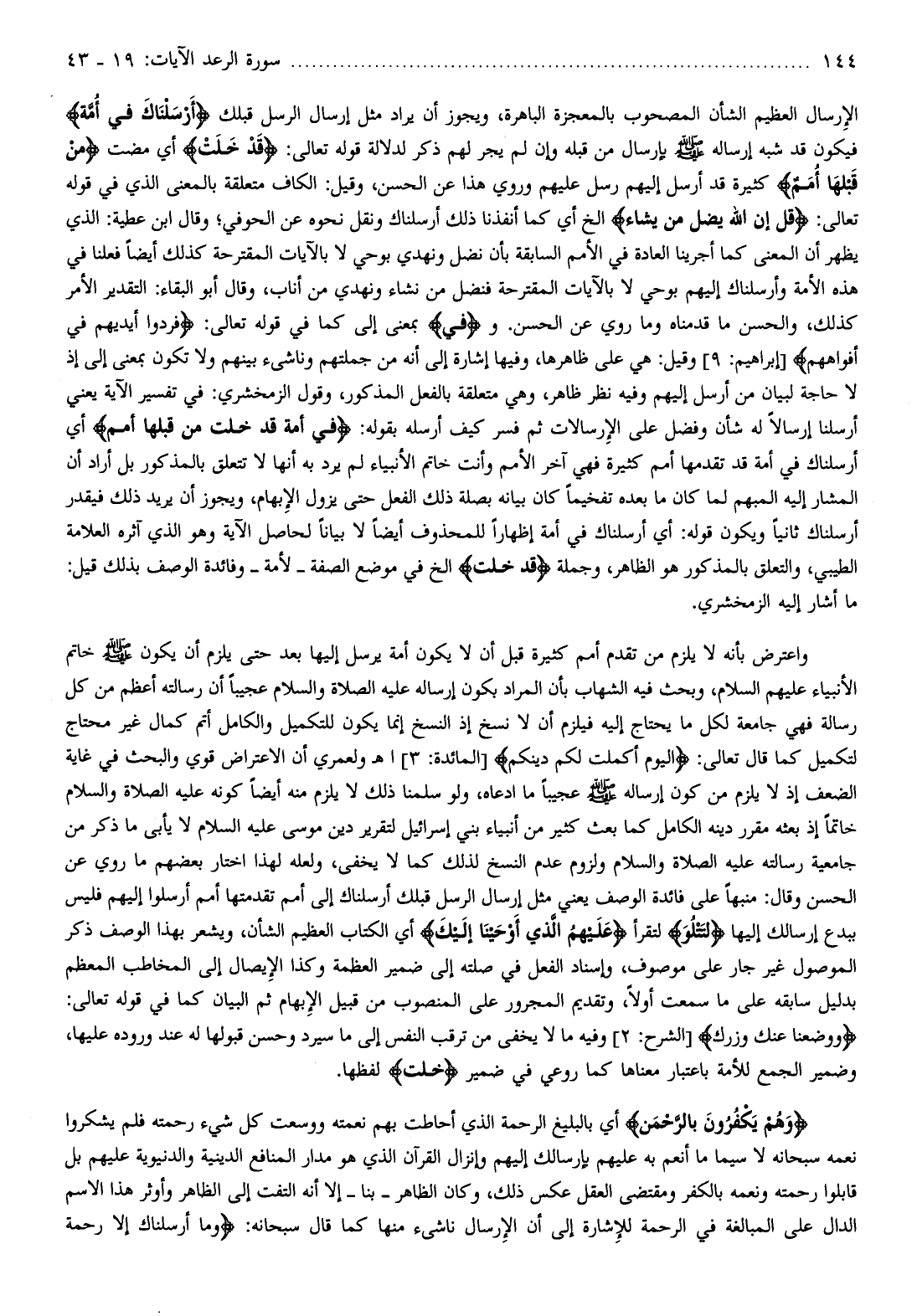 واعترض بأنه لا يلزم من تقدم أمم كثيرة قبل أن لا يكون أمة يرسل إليها بعد حتى يلزم أن يكون صلى الله عليه وسلم خاتم الأنبياء عليهم السلام، وبحث فيه الشهاب بأن المراد بكون إرساله عليه الصلاة والسلام عجيبا أن رسالته أعظم من كل رسالة فهي جامعة لكل ما يحتاج إليه فيلزم أن لا نسخ إذ النسخ إنما يكون للتكميل والكامل أتم كمال غير محتاج لتكميل كما قال تعالى: الْيَوْمَ أَكْمَلْتُ لَكُمْ دِينَكُمْ [المائدة: 3] اه ولعمري أن الاعتراض قوي والبحث في غاية الضعف إذ لا يلزم من كون إرساله صلى الله عليه وسلم عجيبا ما ادعاه، ولو سلمنا ذلك لا يلزم منه أيضا كونه عليه الصلاة والسلام خاتما إذ بعثه مقرر دينه الكامل كما بعث كثير من أنبياء بني إسرائيل لتقرير دين موسى عليه السلام لا يأبى ما ذكر من جامعية رسالته عليه الصلاة والسلام ولزوم عدم النسخ لذلك كما لا يخفى، ولعله لهذا اختار بعضهم ما روي عن الحسن وقال: منبها على فائدة الوصف يعني مثل إرسال الرسل قبلك أرسلناك إلى أمم تقدمتها أمم أرسلوا إليهم فليس ببدع إرسالك إليها لِتَتْلُوَا لتقرأ عَلَيْهِمُ الَّذِي أَوْحَيْنا إِلَيْكَ أي الكتاب العظيم الشأن، ويشعر بهذا الوصف ذكر الموصول غير جار على موصوف، وإسناد الفعل في صلته إلى ضمير العظمة وكذا الإيصال إلى المخاطب المعظم بدليل سابقه على ما سمعت أولا، وتقديم المجرور على المنصوب من قبيل الإبهام ثم البيان كما في قوله تعالى: