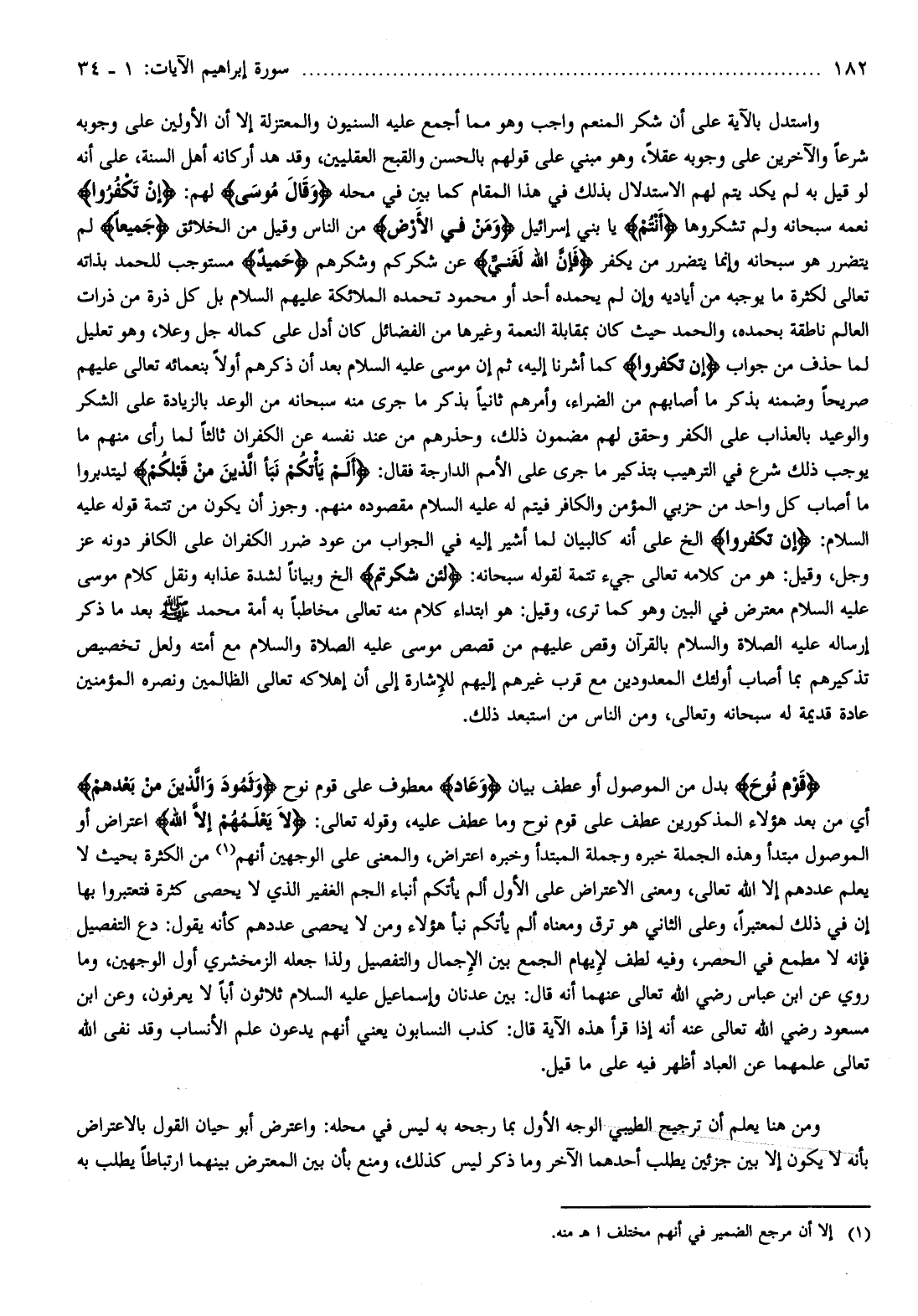 واستدل بالآية على أن شكر المنعم واجب وهو مما أجمع عليه السنيون والمعتزلة إلا أن الأولين على وجوبه شرعا والآخرين على وجوبه عقلا، وهو مبني على قولهم بالحسن والقبح العقليين، وقد هد أركانه أهل السنة، على أنه لو قيل به لم يكد يتم لهم الاستدلال بذلك في هذا المقام كما بين في محله وَقالَ مُوسى لهم: إِنْ تَكْفُرُوا نعمه سبحانه ولم تشكروها أَنْتُمْ يا بني إسرائيل وَمَنْ فِي الْأَرْضِ من الناس وقيل من الخلائق جَمِيعاً لم يتضرر هو سبحانه وإنما يتضرر من يكفر فَإِنَّ اللَّهَ لَغَنِيٌّ عن شكركم وشكرهم حَمِيدٌ مستوجب للحمد بذاته تعالى لكثرة ما يوجبه من أياديه وإن لم يحمده أحد أو محمود تحمده الملائكة عليهم السلام بل كل ذرة من ذرات العالم ناطقة بحمده، والحمد حيث كان بمقابلة النعمة وغيرها من الفضائل كان أدل على كماله جل وعلا، وهو تعليل لما حذف من جواب إِنْ تَكْفُرُوا كما أشرنا إليه، ثم إن موسى عليه السلام بعد أن ذكرهم أولا بنعمائه تعالى عليهم صريحا وضمنه بذكر ما أصابهم من الضراء، وأمرهم ثانيا بذكر ما جرى منه سبحانه من الوعد بالزيادة على الشكر والوعيد بالعذاب على الكفر وحقق لهم مضمون ذلك، وحذرهم من عند نفسه عن الكفران ثالثا لما رأى منهم ما يوجب ذلك شرع في الترهيب بتذكير ما جرى على الأمم الدارجة فقال: أَلَمْ يَأْتِكُمْ نَبَؤُا الَّذِينَ مِنْ قَبْلِكُمْ ليتدبروا ما أصاب كل واحد من حزبي المؤمن والكافر فيتم له عليه السلام مقصوده منهم. وجوز أن يكون من تتمة قوله عليه السلام: إِنْ تَكْفُرُوا إلخ على أنه كالبيان لما أشير إليه في الجواب من عود ضرر الكفران على الكافر دونه عز وجل، وقيل: هو من كلامه تعالى جيء تتمة لقوله سبحانه: لَئِنْ شَكَرْتُمْ إلخ وبيانا لشدة عذابه ونقل كلام موسى عليه السلام معترض في البين وهو كما ترى، وقيل: هو ابتداء كلام منه تعالى مخاطبا به أمة محمد صلى الله عليه وسلم بعد ما ذكر إرساله عليه الصلاة والسلام بالقرآن وقص عليهم من قصص موسى عليه الصلاة والسلام مع أمته ولعل تخصيص تذكيرهم بما أصاب أولئك المعدودين مع قرب غيرهم إليهم للإشارة إلى أن إهلاكه تعالى الظالمين ونصره المؤمنين عادة قديمة له سبحانه وتعالى، ومن الناس من استبعد ذلك.
