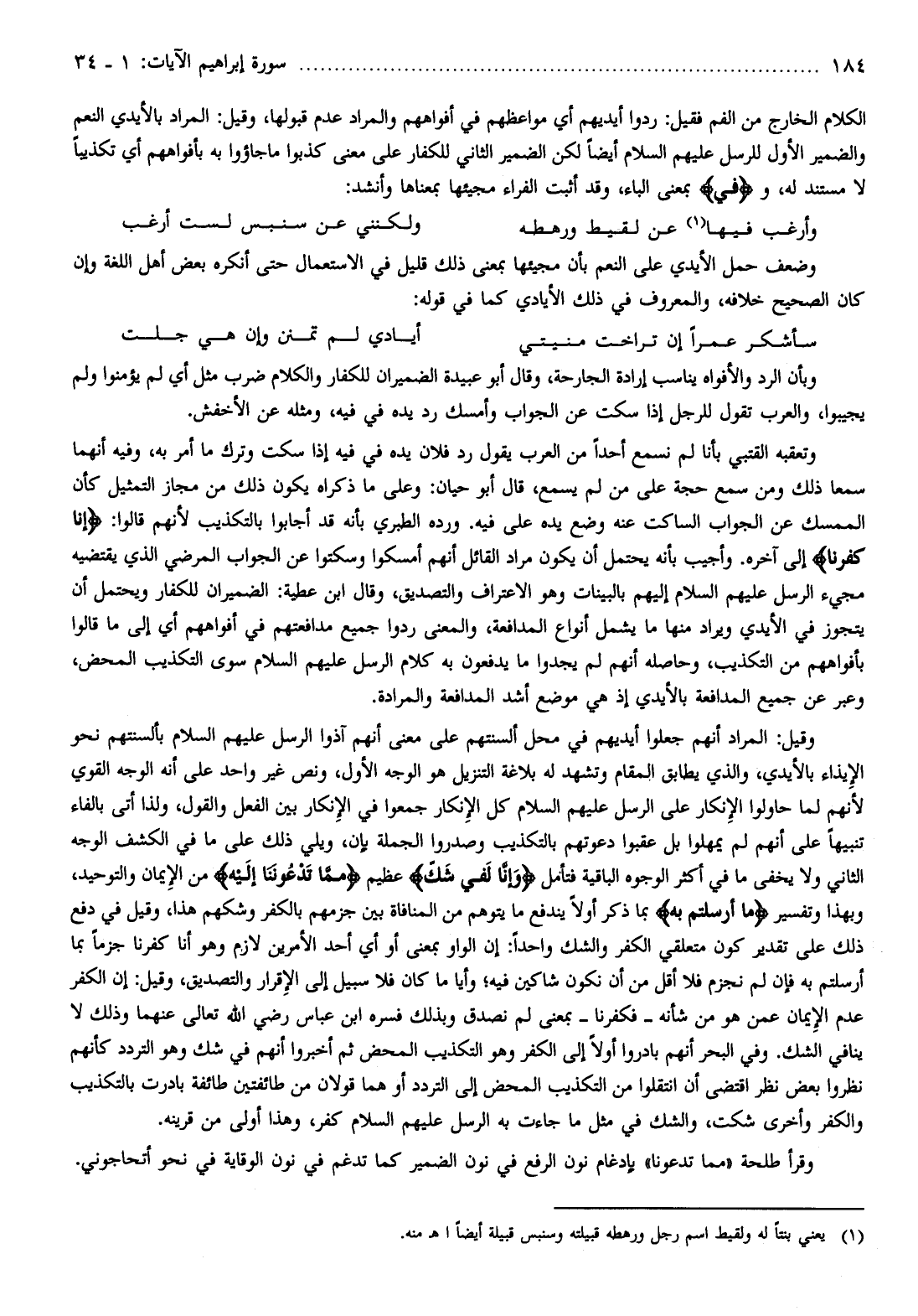 وبأن الرد والأفواه يناسب إرادة الجارحة، وقال أبو عبيدة الضميران للكفار والكلام ضرب مثل أي لم يؤمنوا ولم يجيبوا، والعرب تقول للرجل إذا سكت عن الجواب وأمسك رد يده في فيه، ومثله عن الأخفش.