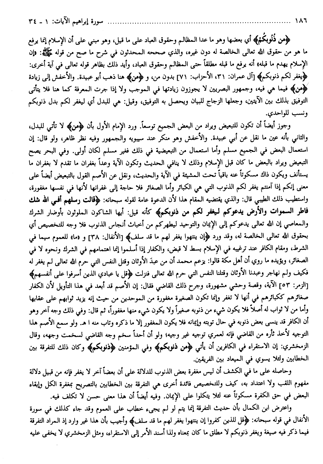يَغْفِرْ لَكُمْ ذُنُوبَكُمْ [آل عمران: 31، الأحزاب: 71] بدون من، ومِنْ هنا ذهب أبو عبيدة. والأخفش إلى زيادة مِنْ فيما هي فيه، وجمهور البصريين لا يجوزون زيادتها في الموجب ولا إذا جرت المعرفة كما هنا فلا يتأتى التوفيق بذلك بين الآيتين، وجعلها الزجاج للبيان ويحصل به التوفيق، وقيل: هي للبدل أي ليغفر لكم بدل ذنوبكم ونسب للواحدي.