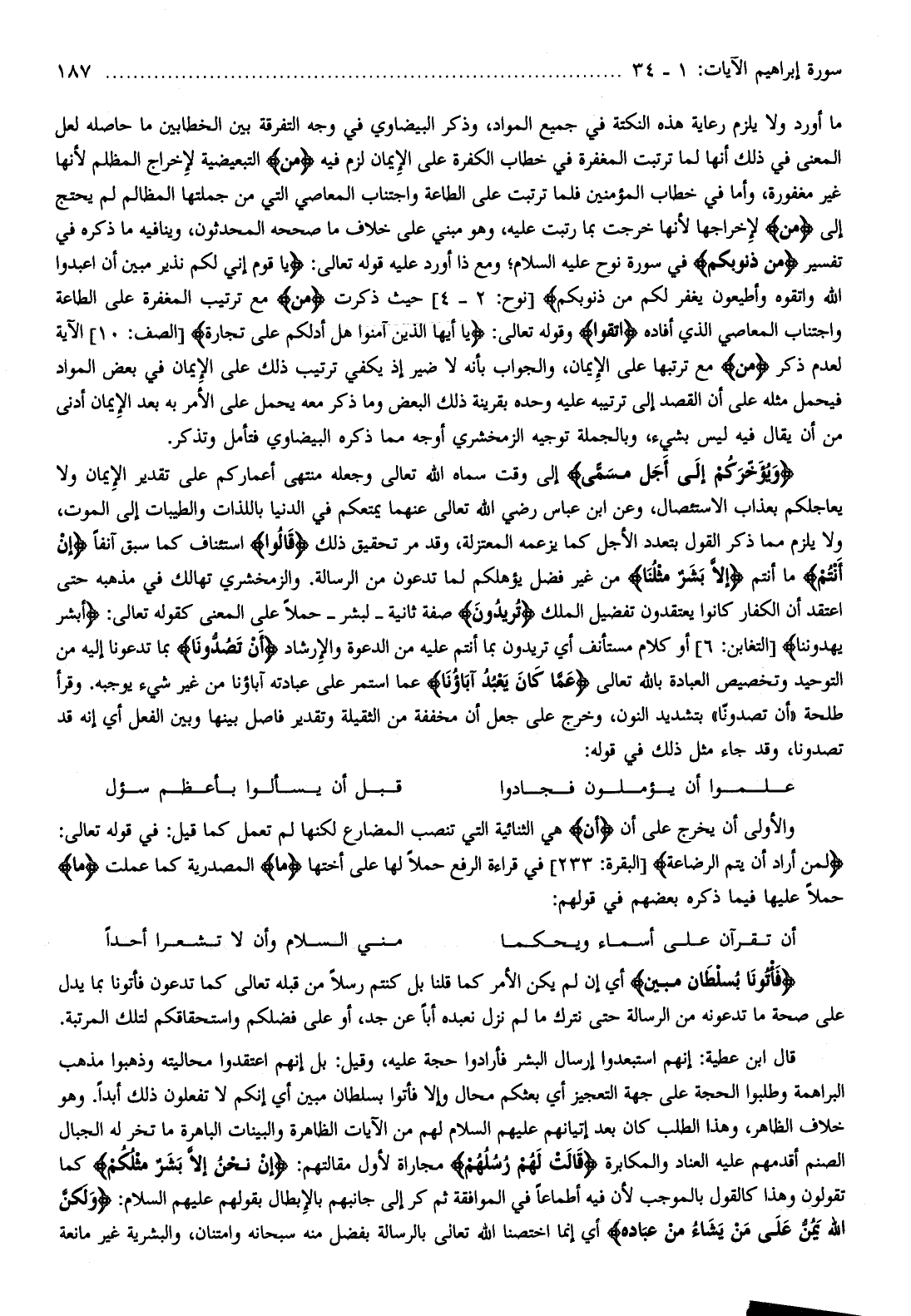 ما أورد ولا يلزم رعاية هذه النكتة في جميع المواد، وذكر البيضاوي في وجه التفرقة بين الخطابين ما حاصله لعل المعنى في ذلك أنها لما ترتبت المغفرة في خطاب الكفرة على الإيمان لزم فيه مِنْ التبعيضية لإخراج المظلم لأنها غير مغفورة، وأما في خطاب المؤمنين فلما ترتبت على الطاعة واجتناب المعاصي التي من جملتها المظالم لم يحتج إلى مِنْ لإخراجها لأنها خرجت بما رتبت عليه، وهو مبني على خلاف ما صححه المحدثون، وينافيه ما ذكره في تفسير مِنْ ذُنُوبِكُمْ في سورة نوح عليه السلام ومع ذا أورد عليه قوله تعالى: يا قَوْمِ إِنِّي لَكُمْ نَذِيرٌ مُبِينٌ أَنِ اعْبُدُوا اللَّهَ وَاتَّقُوهُ وَأَطِيعُونِ يَغْفِرْ لَكُمْ مِنْ ذُنُوبِكُمْ [نوح: 2- 4] حيث ذكرت مِنْ مع ترتيب المغفرة على الطاعة واجتناب المعاصي الذي أفاده اتقوا وقوله تعالى: يا أَيُّهَا الَّذِينَ آمَنُوا هَلْ أَدُلُّكُمْ عَلى تِجارَةٍ [الصف: 10] الآية لعدم ذكر مِنْ مع ترتبها على الإيمان، والجواب بأنه لا ضير إذ يكفي ترتيب ذلك على الإيمان في بعض المواد فيحمل مثله على أن القصد إلى ترتيبه عليه وحده بقرينة ذلك البعض وما ذكر معه يحمل على الأمر به بعد الإيمان أدنى من أن يقال فيه ليس بشيء، وبالجملة توجيه الزمخشري أوجه مما ذكره البيضاوي فتأمل وتذكر.