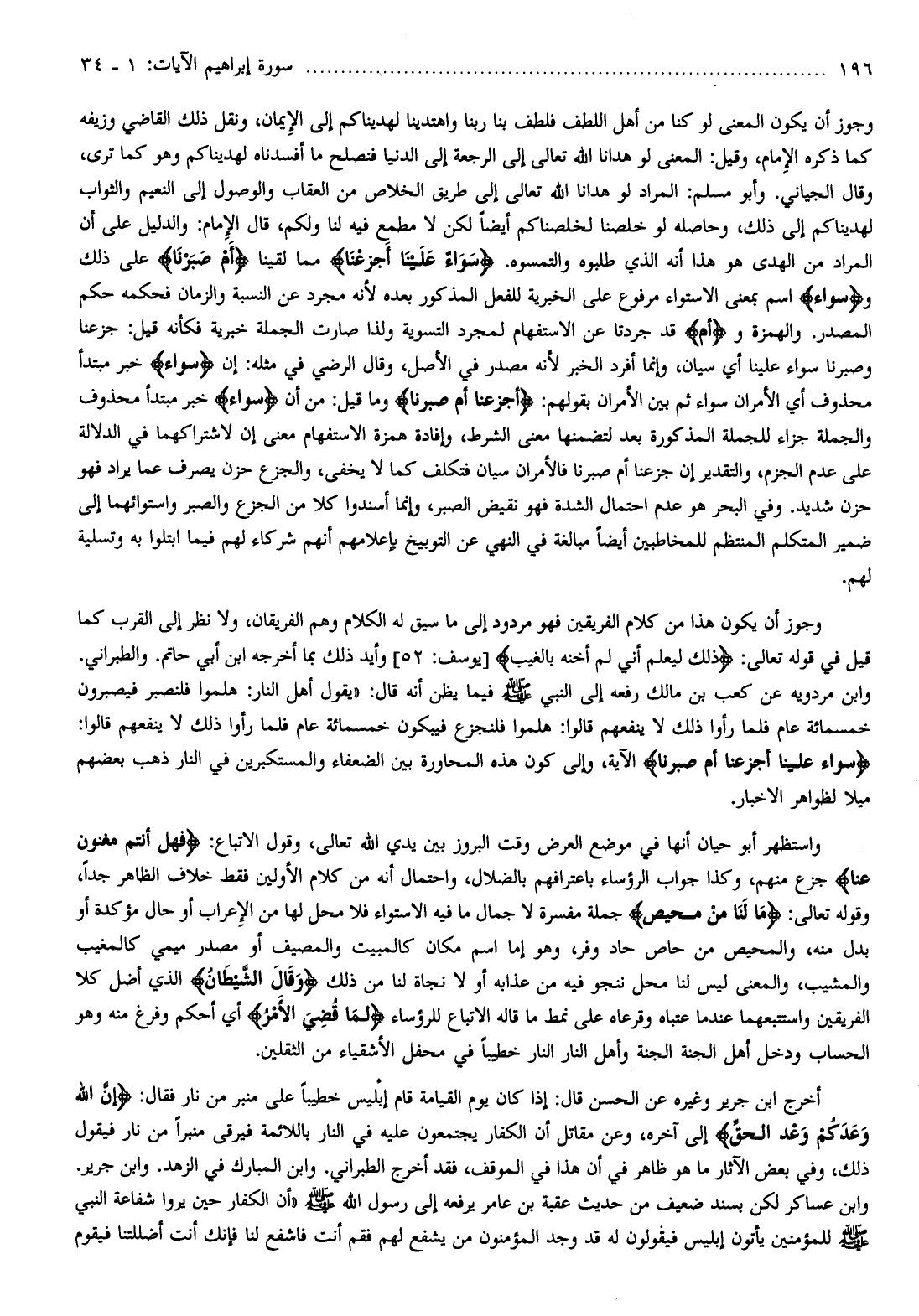 واستظهر أبو حيان أنها في موضع العرض وقت البروز بين يدي الله تعالى، وقول الاتباع: فَهَلْ أَنْتُمْ مُغْنُونَ عَنَّا جزع منهم، وكذا جواب الرؤساء باعترافهم بالضلال، واحتمال أنه من كلام الأولين فقط خلاف الظاهر جدا، وقوله تعالى: ما لَنا مِنْ مَحِيصٍ جملة مفسرة لا جمال ما فيه الاستواء فلا محل لها من الإعراب أو حال مؤكدة أو بدل منه، والمحيص من حاص حاد وفر، وهو إما اسم مكان كالمبيت والمصيف أو مصدر ميمي كالمغيب والمشيب، والمعنى ليس لنا محل ننجو فيه من عذابه أو لا نجاة لنا من ذلك وَقالَ الشَّيْطانُ الذي أضل كلا الفريقين واستتبعهما عند ما عتباه وقرعاه على نمط ما قاله الاتباع للرؤساء لَمَّا قُضِيَ الْأَمْرُ أي أحكم وفرغ منه وهو الحساب ودخل أهل الجنة الجنة وأهل النار النار خطيبا في محفل الأشقياء من الثقلين.
