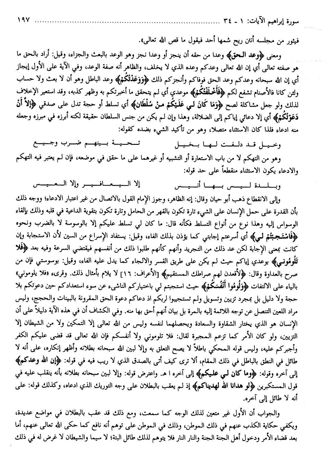 وإلى الانقطاع ذهب أبو حيان وقال: إنه الظاهر، وجوز الإمام القول بالاتصال من غير اعتبار الادعاء ووجه ذلك بأن القدرة على حمل الإنسان على الشيء تارة تكون بالقهر من الحامل وتارة تكون بتقوية الداعية في قلبه وذلك بإلقاء الوسواس إليه وهذا نوع من أنواع التسلط فكأنه قال: ما كان لي تسلط عليكم إلا بالوسوسة لا بالضرب ونحوه فَاسْتَجَبْتُمْ لِي أي أسرعتم إجابتي كما يؤذن بذلك الفاء، وقيل: يستفاد الإسراع من السين لأن الاستجابة وإن كانت بمعنى الإجابة لكن عد ذلك من التجريد وأنهم كأنهم طلبوا ذلك من أنفسهم فيقتضي السرعة وفيه بعد فَلا تَلُومُونِي بوعدي إياكم حيث لم يكن على طريق القسر والإلجاء كما يدل عليه الفاء، وقيل: بوسوستي فإن من صرح بالعداوة وقال: لَأَقْعُدَنَّ لَهُمْ صِراطَكَ الْمُسْتَقِيمَ [الأعراف: 16] لا يلام بأمثال ذلك. وقرئ «فلا يلوموني» بالياء على الالتفات وَلُومُوا أَنْفُسَكُمْ حيث استجبتم لي باختياركم الناشئ عن سوء استعدادكم حين دعوتكم بلا حجة ولا دليل بل بمجرد تزيين وتسويل ولم تستجيبوا لربكم إذ دعاكم دعوة الحق المقرونة بالبينات والحجج، وليس مراد اللعين التنصل عن توجه اللائمة إليه بالمرة بل بيان أنهم أحق بها منه. وفي الكشاف أن في هذه الآية دليلا على أن الإنسان هو الذي يختار الشقاوة والسعادة ويحصلهما لنفسه وليس من الله تعالى إلا التمكين ولا من الشيطان إلا التزيين، ولو كان الأمر كما تزعم المجبرة لقال: فلا تلوموني ولا أنفسكم فإن الله تعالى قد قضى عليكم الكفر وأجبركم عليه، وليس قوله المحكي باطلا لا يصح التعلق به وإلا لبين الله سبحانه بطلانه وأظهر إنكاره، على أنه لا طائل في النطق بالباطل في ذلك المقام، ألا ترى كيف أتى بالصدق الذي لا ريب فيه في قوله: إِنَّ اللَّهَ وَعَدَكُمْ إلى آخره وقوله: وَما كانَ لِي عَلَيْكُمْ إلى آخره اه. واعترض قوله: وإلا لبين سبحانه بطلانه بأنه ينقلب عليه في قول المستكبرين لَوْ هَدانَا اللَّهُ لَهَدَيْناكُمْ إذ لم يعقب بالبطلان على وجه التوريك الذي ادعاه، وكذلك قوله: على أنه لا طائل إلى آخره.