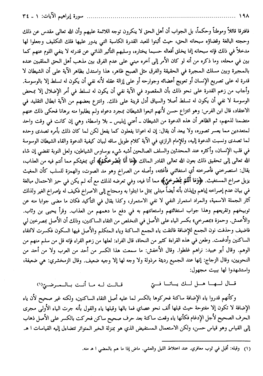 وأجاب من زعم القدرة على نحو ذلك بأن المقصود في الآية نفي أن يكون له تسلط في أمر الإضلال إلا بمحض الوسوسة لا نفي أن يكون له تسلط أصلا والسياق أدل قرينة على ذلك. وانتزع بعضهم من الآية ابطال التقليد في الاعتقاد، قال ابن الفرس: وهو انتزاع حسن لأنهم اتبعوا الشيطان بمجرد دعواه ولم يطلبوا منه برهانا فحكى ذلك عنهم متضمنا لذمهم، ثم الظاهر أن هذه الدعوة من الشيطان- أعني إبليس- بلا واسطة، وهي إن كانت في وقت واحد لمتعددين مما يعسر تصوره، ولا يبعد أن يقال: إن له أعوانا يفعلون كما يفعل لكن لما كان ذلك بأمره تصدى وحده لما تصدى ونسبت الدعوة إليه، وللإمام الرازي في الآية كلام طويل ساقه لبيان كيفية الدعوة وإلقاء الشيطان الوسوسة في قلب الإنسان، وأكثره عند المحدثين والسلف الصالحين أشبه شيء بوساوس الشياطين، ولعل النوبة تفضي إن شاء الله تعالى إلى تحقيق ذلك بعون الله تعالى القادر المالك ما أَنَا بِمُصْرِخِكُمْ أي بمغيثكم مما أنتم فيه من العذاب، يقال: استصرخني فأصرخته أي استغاثني فأغثته، وأصله من الصراخ وهو مد الصوت، والهمزة للسلب كأن المغيث يزيل صراخ المستغيث. وَما أَنْتُمْ بِمُصْرِخِيَّ مما أنا فيه، وفي تعرضه لذلك مع أنه لم يكن في حيز الاحتمال مبالغة في بيان عدم إصراخه إياهم وإيذان بأنه أيضا مبتلى بمثل ما ابتلوا به ومحتاج إلى الاصراخ فكيف له بإصراخ الغير ولذلك آثار الجملة الاسمية، والمراد استمرار النفي لا نفي الاستمرار، وكذا يقال في التأكيد فكان ما مضى جوابا منه عن توبيخهم وتقريعهم وهذا جواب استغاثتهم واستعانتهم به في دفع ما دهمهم من العذاب. وقرأ يحيى بن وثاب.