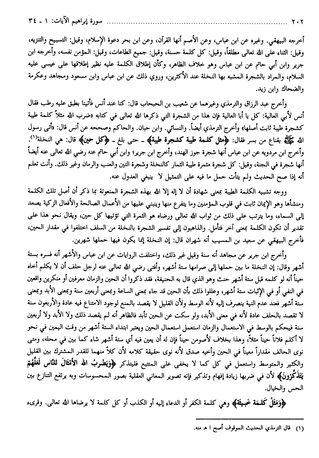 وأخرج الترمذي أيضا. والنسائي. وابن حبان. والحاكم وصححه عن أنس قال: «أتى رسول الله صلى الله عليه وسلم بقناع من بسر فقال: مَثَلًا كَلِمَةً طَيِّبَةً كَشَجَرَةٍ طَيِّبَةٍ- حتى بلغ- كُلَّ حِينٍ قال: هي النخلة (¬1) .
