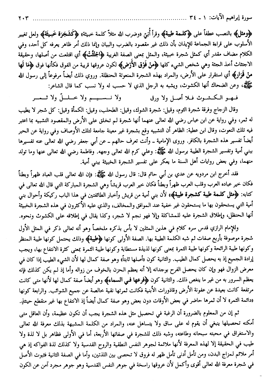 وروى الإمامية- وأنت تعرف حالهم- عن أبي جعفر رضي الله تعالى عنه تفسيرها ببني أمية وتفسير الشجرة الطيبة برسول الله صلى الله عليه وسلم: وعلي كرم الله تعالى وجهه. وفاطمة رضي الله تعالى عنها وما تولد منهما،