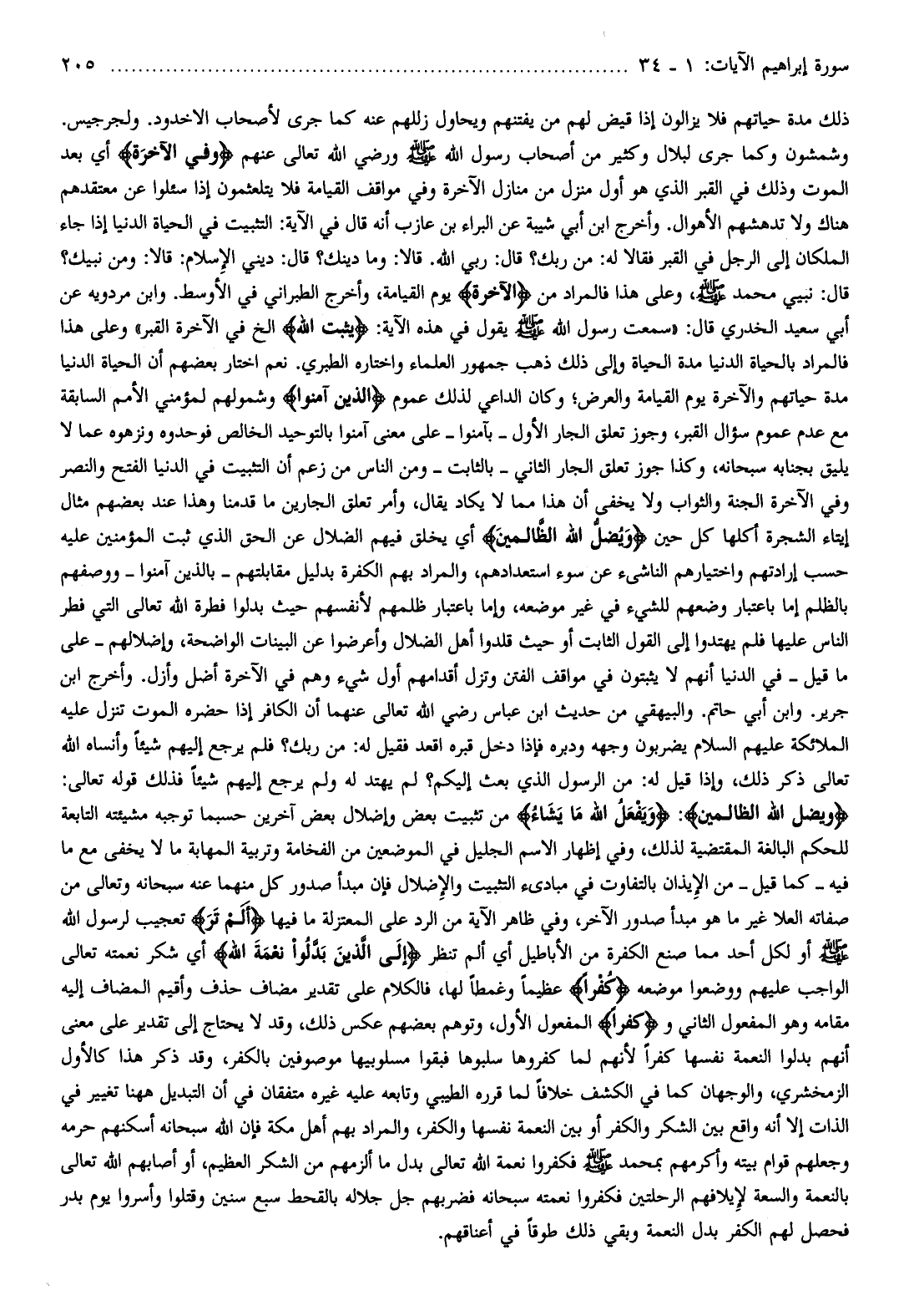 وأخرج الطبراني في الأوسط. وابن مردويه عن أبي سعيد الخدري قال: «سمعت رسول الله صلى الله عليه وسلم يقول في هذه الآية: يُثَبِّتُ اللَّهُ إلخ في الآخرة القبر»