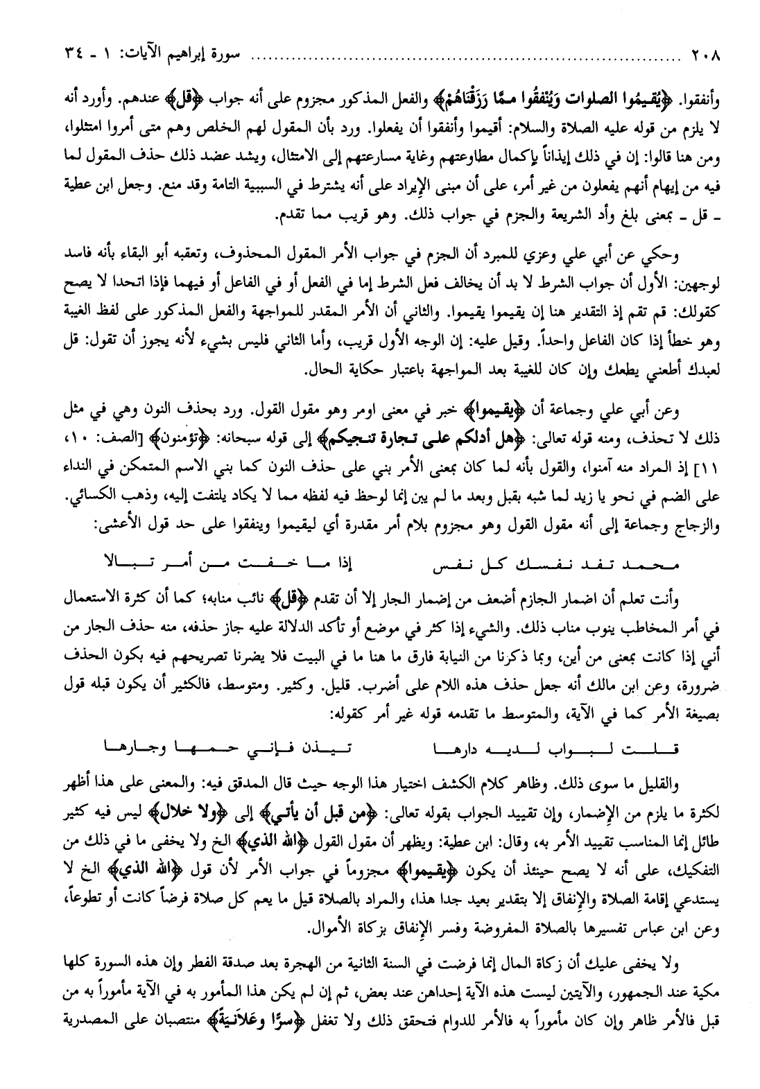 وأنفقوا. يُقِيمُوا الصَّلاةَ وَيُنْفِقُوا مِمَّا رَزَقْناهُمْ والفعل المذكور مجزوم على أنه جواب قُلْ عندهم. وأورد أنه لا يلزم من قوله عليه الصلاة والسلام: أقيموا وأنفقوا أن يفعلوا. ورد بأن المقول لهم الخلص وهم متى أمروا امتثلوا، ومن هنا قالوا: إن في ذلك إيذانا بإكمال مطاوعتهم وغاية مسارعتهم إلى الامتثال، ويشد عضد ذلك حذف المقول لما فيه من إيهام أنهم يفعلون من غير أمر، على أن مبنى الإيراد على أنه يشترط في السببية التامة وقد منع. وجعل ابن عطية- قل- بمعنى بلغ وأد الشريعة والزم في جواب ذلك. وهو قريب مما تقدم.