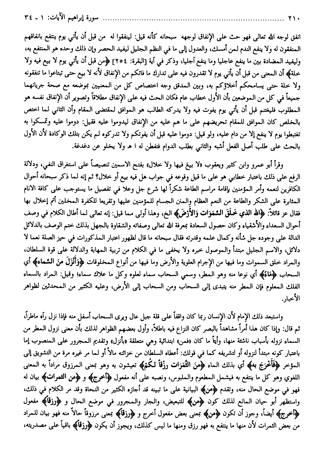 وقرأ أبو عمرو وابن كثير ويعقوب «لا بيع فيها ولا خلال» بفتح الاسمين تنصيصا على استغراق النفي، ودلالة الرفع على ذلك باعتبار خطابي هو على ما قيل وقوعه في جواب هل فيه بيع أو خلال؟ ثم إنه لما ذكر سبحانه أحوال الكافرين لنعمه وأمر المؤمنين بإقامة مراسم الطاعة شكرا لها شرع جل وعلا في تفصيل ما يستوجب على كافة الأنام المثابرة على الشكر والطاعة من النعم العظام والمنن الجسام للمؤمنين عليها وتقريعا للكفرة المخلين أتم إخلال بها فقال عز قائلا: اللَّهُ الَّذِي خَلَقَ السَّماواتِ وَالْأَرْضَ إلخ، وهذا أولى مما قيل: إنه تعالى لما أطال الكلام في وصف أحوال السعداء والأشقياء وكان حصول السعادة بمعرفة الله تعالى وصفاته والشقاوة بالجهل بذلك ختم الوصف بالدلائل الدالة على وجوده جل شأنه وكمال علمه وقدرته فقال سبحانه ما قال لظهور اعتبار المذكورات في حيز الصلة نعما لا دلائل، والاسم الجليل مبتدأ والموصول خبره ولا يخفى ما في الكلام من تربية المهابة والدلالة على قوة السلطان، والمراد خلق السموات وما فيها من الإجرام العلوية والأرض وما فيها من أنواع المخلوقات وَأَنْزَلَ مِنَ السَّماءِ أي السحاب ماءً أي نوعا منه وهو المطر، وسمي السحاب سماء لعلوه وكل ما علاك سماء وقيل: المراد بالسماء الفلك المعلوم فإن المطر منه يتبدى إلى السحاب ومن السحاب إلى الأرض، وعليه الكثير من المحدثين لظواهر الأخبار.