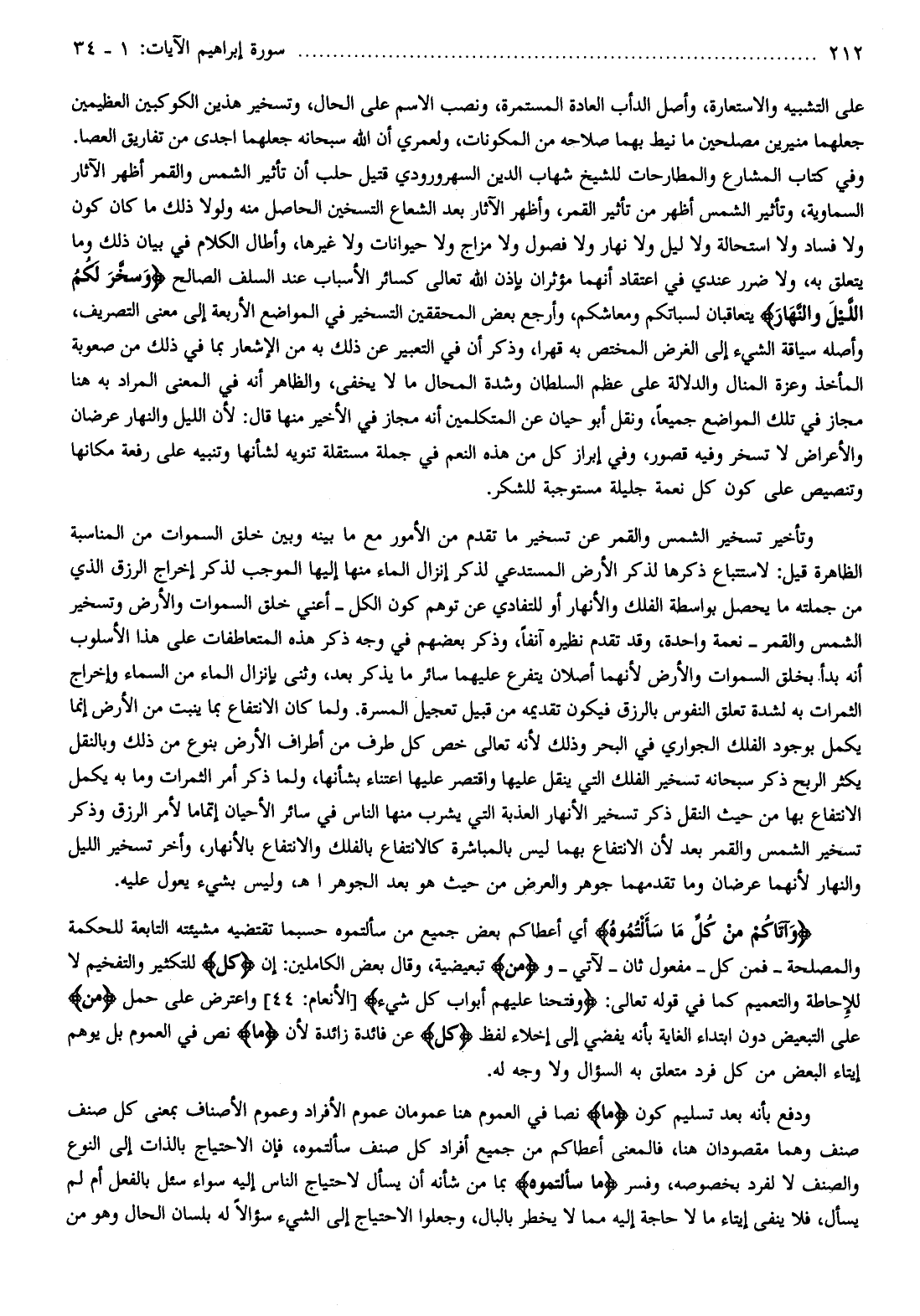 وفي كتاب المشارع والمطارحات للشيخ شهاب الدين السهروردي قتيل حلب أن تأثير الشمس والقمر أظهر الآثار السماوية، وتأثير الشمس أظهر من تأثير القمر، وأظهر الآثار بعد الشعاع التسخين الحاصل منه ولولا ذلك ما كان كون ولا فساد ولا استحالة ولا ليل ولا نهار ولا فصول ولا مزاج ولا حيوانات ولا غيرها، وأطال الكلام في بيان ذلك وما يتعلق به، ولا ضرر عندي في اعتقاد أنهما مؤثران بإذن الله تعالى كسائر الأسباب عند السلف الصالح وَسَخَّرَ لَكُمُ اللَّيْلَ وَالنَّهارَ يتعاقبان لسباتكم ومعاشكم، وأرجع بعض المحققين التسخير في المواضع الأربعة إلى معنى التصريف، وأصله سياقة الشيء إلى الغرض المختص به قهرا، وذكر أن في التعبير عن ذلك به من الإشعار بما في ذلك من صعوبة المأخذ وعزة المنال والدلالة على عظم السلطان وشدة المحال ما لا يخفى، والظاهر أنه في المعنى المراد به هنا مجاز في تلك المواضع جميعا، ونقل أبو حيان عن المتكلمين أنه مجاز في الأخير منها قال: لأن الليل والنهار عرضان والأعراض لا تسخر وفيه قصور، وفي إبراز كل من هذه النعم في جملة مستقلة تنويه لشأنها وتنبيه على رفعة مكانها وتنصيص على كون كل نعمة جليلة مستوجبة للشكر.