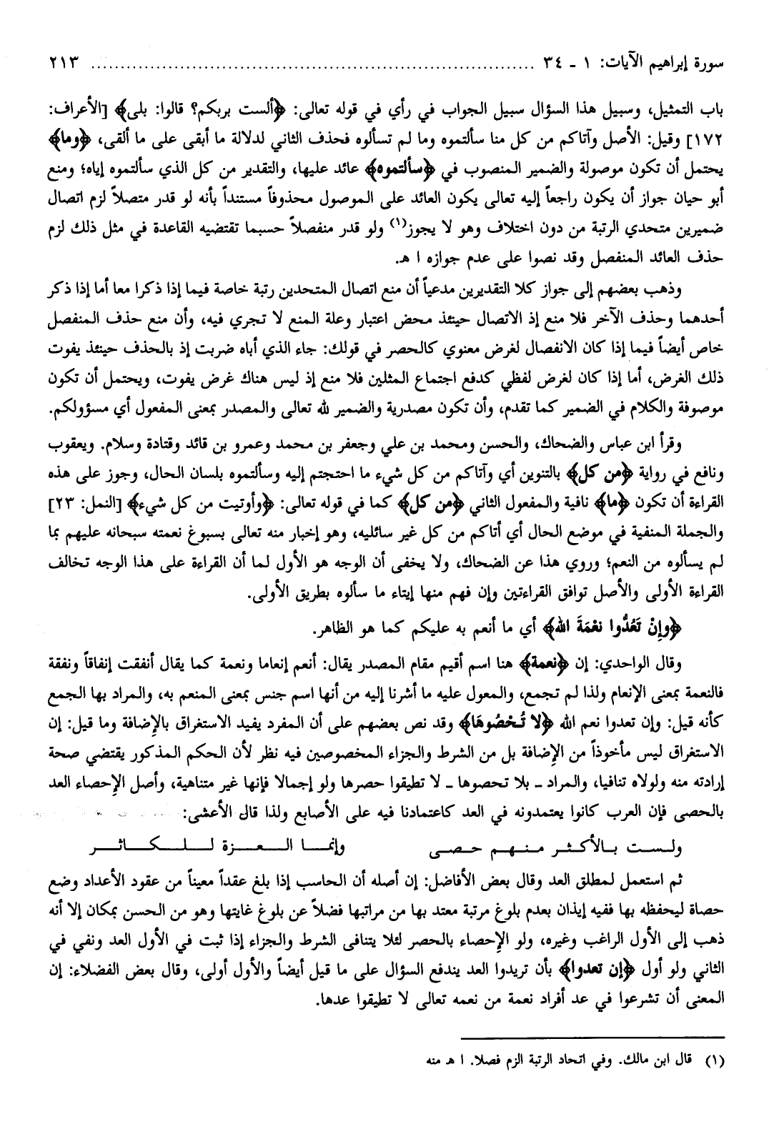 172] وقيل: الأصل وآتاكم من كل منا سألتموه وما لم تسألوه فحذف الثاني لدلالة ما أبقى على ما ألقى، وما يحتمل أن تكون موصولة والضمير المنصوب في سَأَلْتُمُوهُ عائد عليها، والتقدير من كل الذي سألتموه إياه ومنع أبو حيان جواز أن يكون راجعا إليه تعالى يكون العائد على الموصول محذوفا مستندا بأنه لو قدر متصلا لزم اتصال ضميرين متحدي الرتبة من دون اختلاف وهو لا يجوز (¬1) ولو قدر منفصلا حسبما تقتضيه القاعدة في مثل ذلك لزم حذف العائد المنفصل وقد نصوا على عدم جوازه اه.
