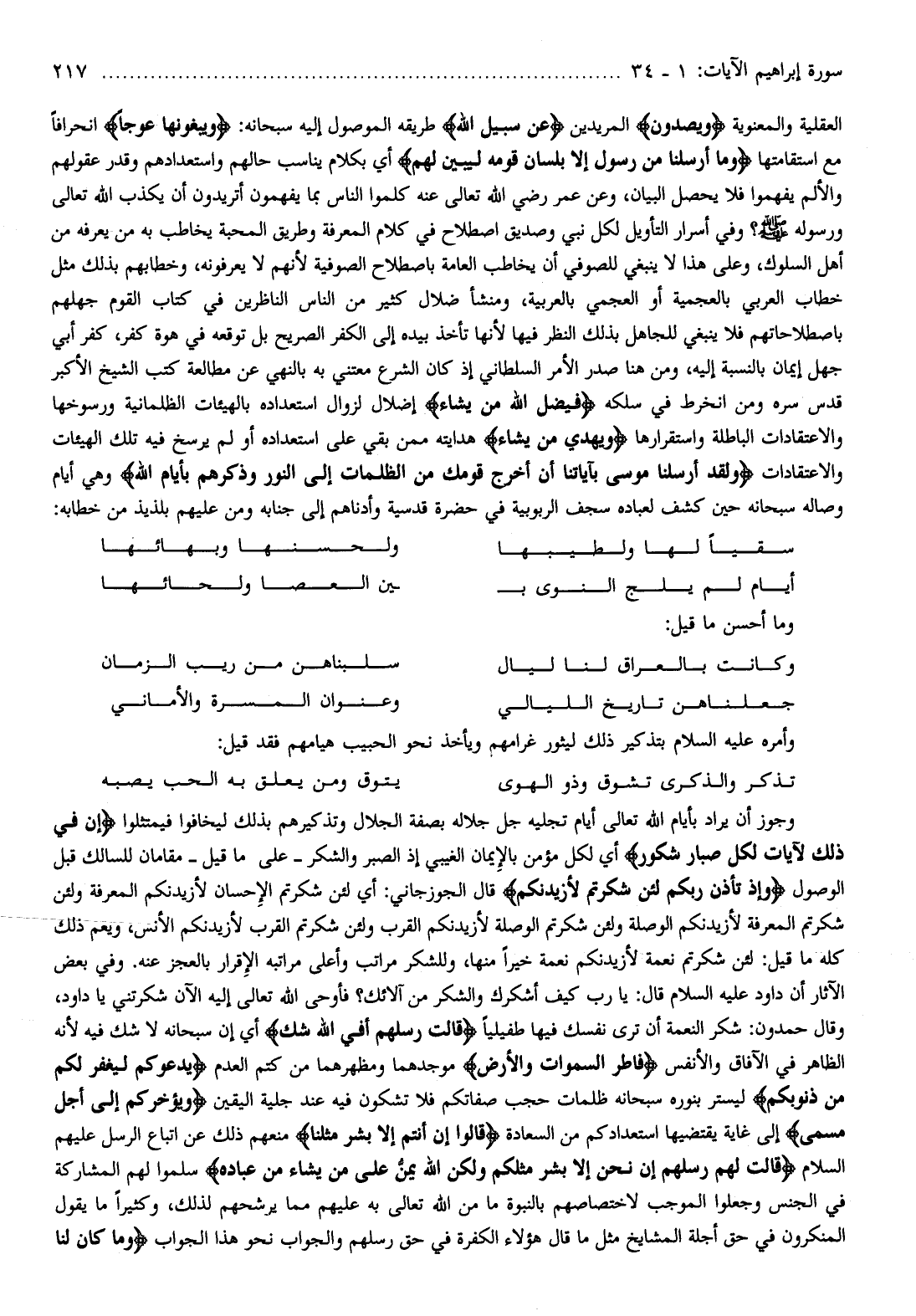 العقلية والمعنوية وَيَصُدُّونَ المريدين عَنْ سَبِيلِ اللَّهِ طريقه الموصول إليه سبحانه: وَيَبْغُونَها عِوَجاً انحرافا مع استقامتها وَما أَرْسَلْنا مِنْ رَسُولٍ إِلَّا بِلِسانِ قَوْمِهِ لِيُبَيِّنَ لَهُمْ أي بكلام يناسب حالهم واستعدادهم وقدر عقولهم والألم يفهموا فلا يحصل البيان، وعن عمر رضي الله تعالى عنه كلموا الناس بما يفهمون أتريدون أن يكذب الله تعالى ورسوله صلى الله عليه وسلم؟ وفي أسرار التأويل لكل نبي وصديق اصطلاح في كلام المعرفة وطريق المحبة يخاطب به من يعرفه من أهل السلوك، وعلى هذا لا ينبغي للصوفي أن يخاطب العامة باصطلاح الصوفية لأنهم لا يعرفونه، وخطابهم بذلك مثل خطاب العربي بالعجمية أو العجمي بالعربية، ومنشأ ضلال كثير من الناس الناظرين في كتاب القوم جهلهم باصطلاحاتهم فلا ينبغي للجاهل بذلك النظر فيها لأنها تأخذ بيده إلى الكفر الصريح بل توقعه في هوة كفر، كفر أبي جهل إيمان بالنسبة إليه، ومن هنا صدر الأمر السلطاني إذ كان الشرع معتني به بالنهي عن مطالعة كتب الشيخ الأكبر قدس سره ومن انخرط في سلكه فَيُضِلُّ اللَّهُ مَنْ يَشاءُ إضلال لزوال استعداده بالهيئات الظلمانية ورسوخها والاعتقادات الباطلة واستقرارها وَيَهْدِي مَنْ يَشاءُ هدايته ممن بقي على استعداده أو لم يرسخ فيه تلك الهيئات والاعتقادات وَلَقَدْ أَرْسَلْنا مُوسى بِآياتِنا أَنْ أَخْرِجْ قَوْمَكَ مِنَ الظُّلُماتِ إِلَى النُّورِ وَذَكِّرْهُمْ بِأَيَّامِ اللَّهِ وهي أيام وصاله سبحانه حين كشف لعباده سجف الربوبية في حضرة قدسية وأدناهم إلى جنابه ومن عليهم بلذيذ من خطابه: