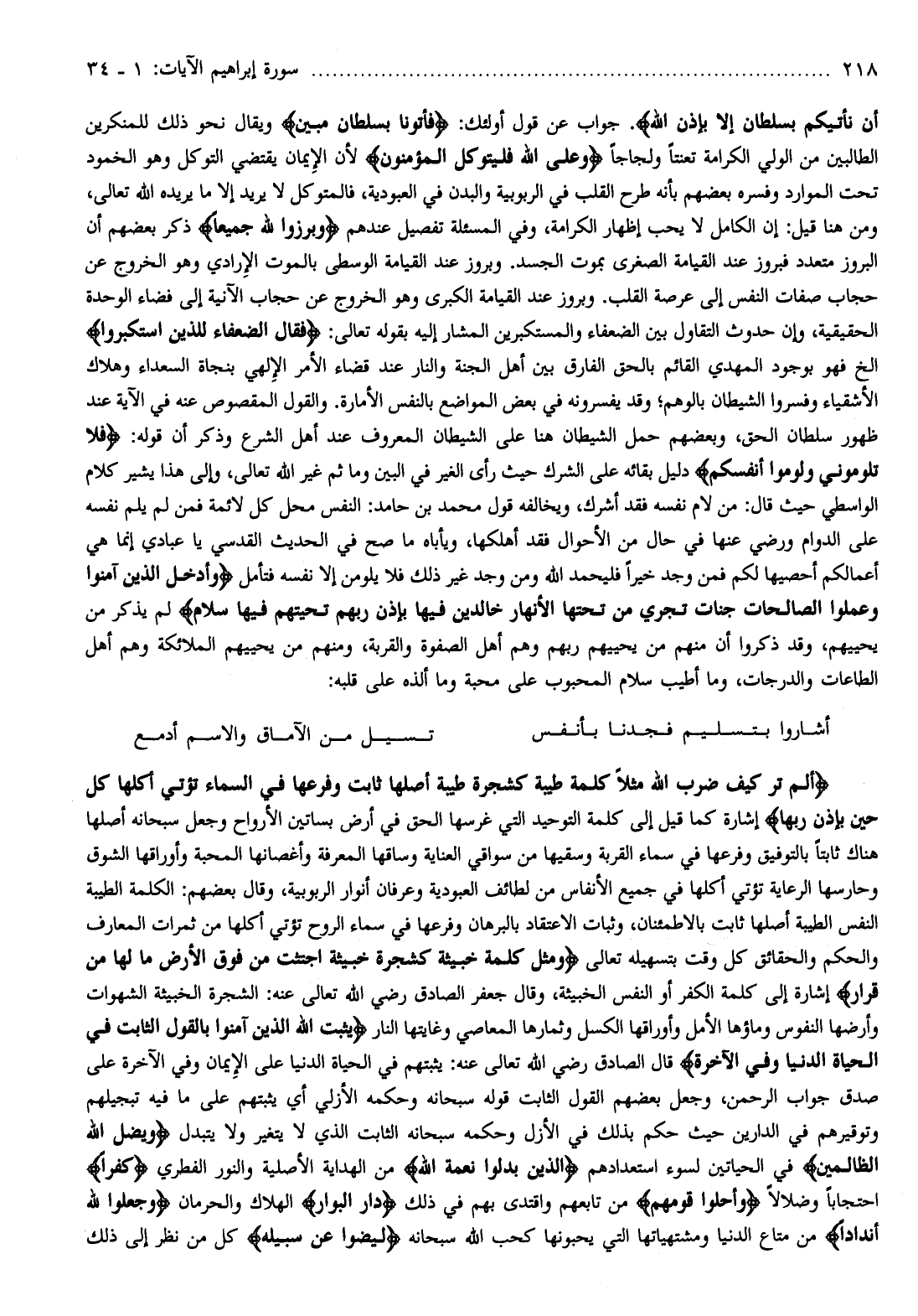 . جواب عن قول أولئك: فَأْتُونا بِسُلْطانٍ مُبِينٍ ويقال نحو ذلك للمنكرين الطالبين من الولي الكرامة تعنتا ولجاجا وَعَلَى اللَّهِ فَلْيَتَوَكَّلِ الْمُؤْمِنُونَ لأن الإيمان يقتضي التوكل وهو الخمود تحت الموارد وفسره بعضهم بأنه طرح القلب في الربوبية والبدن في العبودية، فالمتوكل لا يريد إلا ما يريده الله تعالى، ومن هنا قيل: إن الكامل لا يحب إظهار الكرامة، وفي المسألة تفصيل عندهم وَبَرَزُوا لِلَّهِ جَمِيعاً ذكر بعضهم أن البروز متعدد فبروز عند القيامة الصغرى بموت الجسد. وبروز عند القيامة الوسطى بالموت الإرادي وهو الخروج عن حجاب صفات النفس إلى عرصة القلب. وبروز عند القيامة الكبرى وهو الخروج عن حجاب الآنية إلى فضاء الوحدة الحقيقية، وإن حدوث التقاول بين الضعفاء والمستكبرين المشار إليه بقوله تعالى: فَقالَ الضُّعَفاءُ لِلَّذِينَ اسْتَكْبَرُوا إلخ فهو بوجود المهدي القائم بالحق الفارق بين أهل الجنة والنار عند قضاء الأمر الإلهي بنجاة السعداء وهلاك الأشقياء وفسروا الشيطان بالوهم وقد يفسرونه في بعض المواضع بالنفس الأمارة. والقول المقصوص عنه في الآية عند ظهور سلطان الحق، وبعضهم حمل الشيطان هنا على الشيطان المعروف عند أهل الشرع وذكر أن قوله: فَلا تَلُومُونِي وَلُومُوا أَنْفُسَكُمْ دليل بقائه على الشرك حيث رأى الغير في البين وما ثم غير الله تعالى، وإلى هذا يشير كلام الواسطي حيث قال: من لام نفسه فقد أشرك، ويخالفه قول محمد بن حامد: النفس محل كل لائمة فمن لم يلم نفسه على الدوام ورضي عنها في حال من الأحوال فقد أهلكها، ويأباه ما