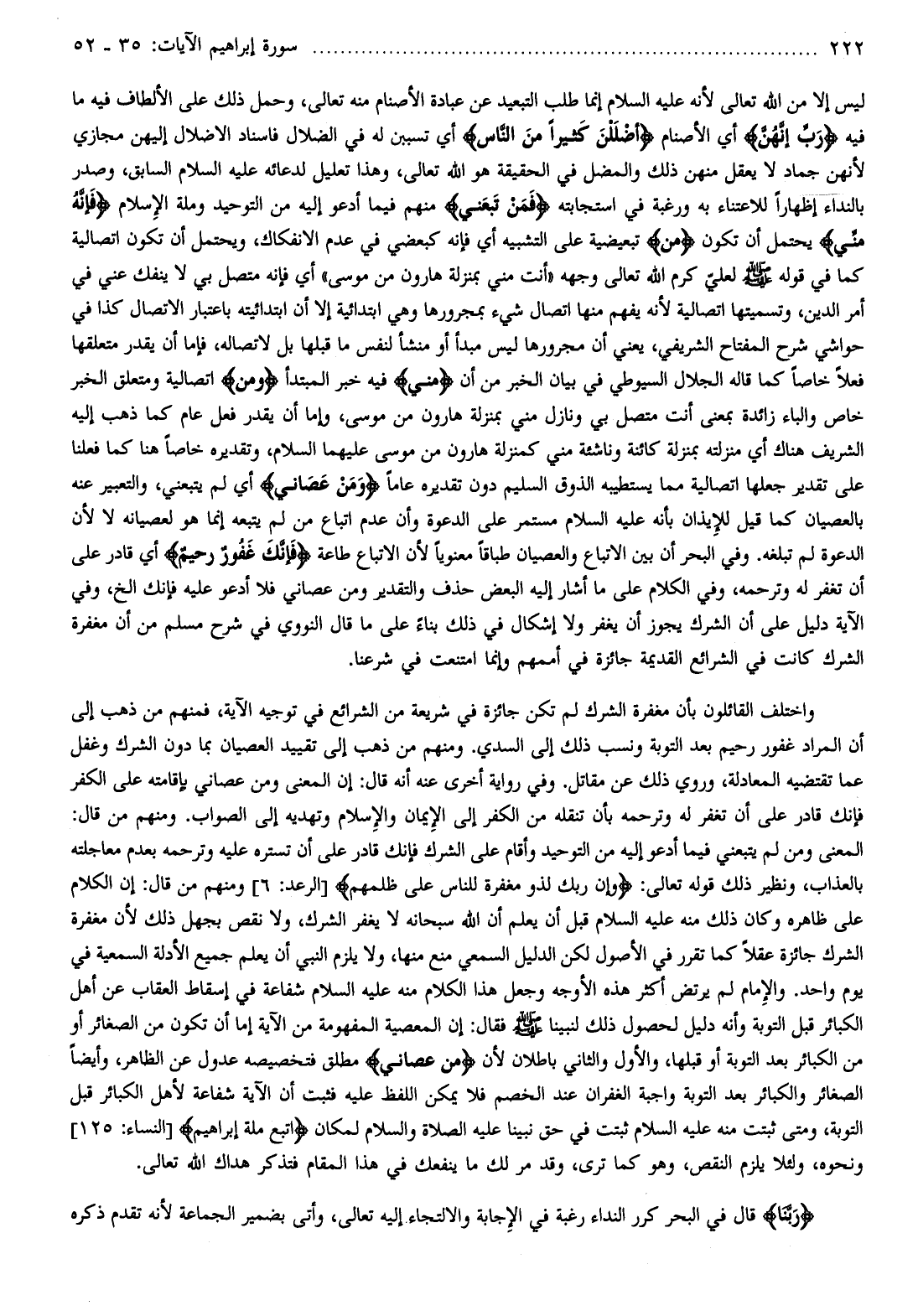 ليس إلا من الله تعالى لأنه عليه السلام إنما طلب التبعيد عن عبادة الأصنام منه تعالى، وحمل ذلك على الألطاف فيه ما فيه رَبِّ إِنَّهُنَّ أي الأصنام أَضْلَلْنَ كَثِيراً مِنَ النَّاسِ أي تسببن له في الضلال فاسناد الإضلال إليهن مجازي لأنهن جماد لا يعقل منهن ذلك والمضل في الحقيقة هو الله تعالى، وهذا تعليل لدعائه عليه السلام السابق، وصدر بالنداء إظهارا للاعتناء به ورغبة في استجابته فَمَنْ تَبِعَنِي منهم فيما أدعو إليه من التوحيد وملة الإسلام فَإِنَّهُ مِنِّي يحتمل أن تكون من تبعيضية على التشبيه أي فإنه كبعضي في عدم الانفكاك، ويحتمل أن تكون اتصالية كما في