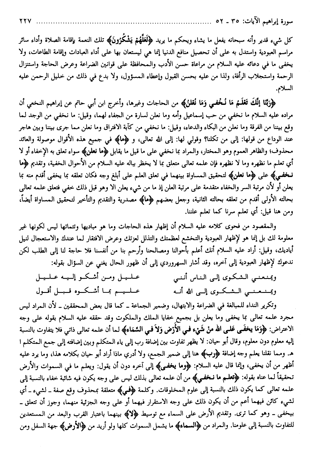 كل شيء قدير وأنه سبحانه يفعل ما يشاء ويحكم ما يريد لَعَلَّهُمْ يَشْكُرُونَ تلك النعمة بإقامة الصلاة وأداء سائر مراسم العبودية واستدل به على أن تحصيل منافع الدنيا إنما هي ليستعان بها على أداء العبادات وإقامة الطاعات، ولا يخفى ما في دعائه عليه السلام من مراعاة حسن الأدب والمحافظة على قوانين الضراعة وعرض الحاجة واستنزال الرحمة واستجلاب الرأفة، ولذا من عليه بحسن القبول وإعطاء المسئول، ولا بدع في ذلك من خليل الرحمن عليه السلام.