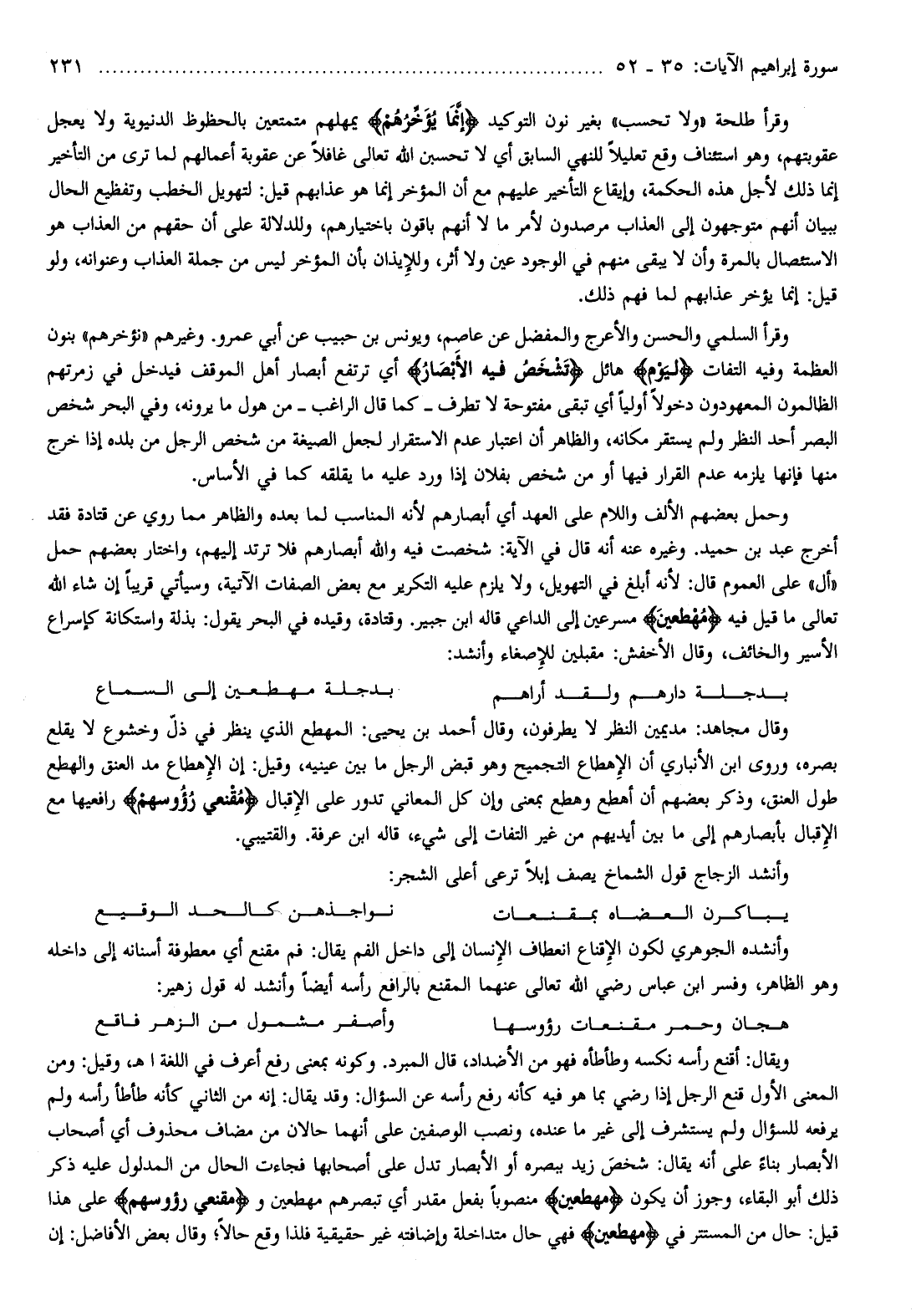 وقال مجاهد: مديمين النظر لا يطرفون، وقال أحمد بن يحيى: المهطع الذي ينظر في ذلّ وخشوع لا يقلع بصره، وروى ابن الأنباري أن الإهطاع التجميح وهو قبض الرجل ما بين عينيه، وقيل: إن الإهطاع مد العنق والهطع طول العنق، وذكر بعضهم أن أهطع وهطع بمعنى وإن كل المعاني تدور على الإقبال مُقْنِعِي رُؤُسِهِمْ رافعيها مع الإقبال بأبصارهم إلى ما بين أيديهم من غير التفات إلى شيء، قاله ابن عرفة. والقتيبي.