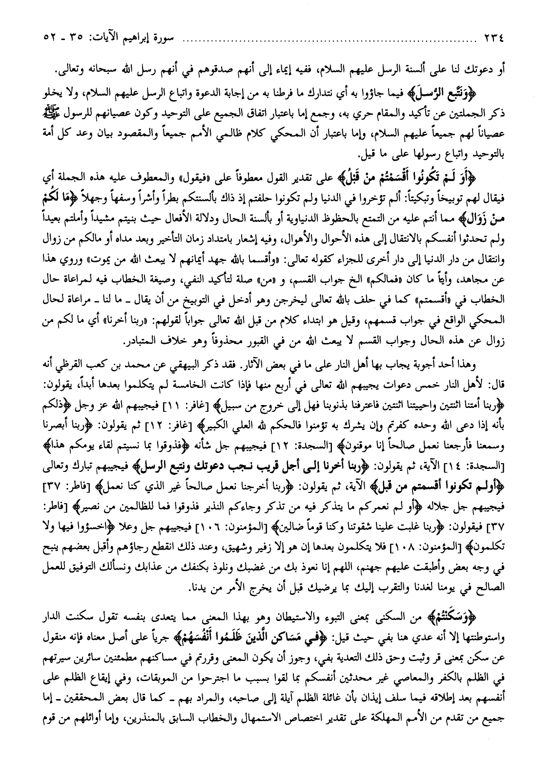 رَبَّنا أَمَتَّنَا اثْنَتَيْنِ وَأَحْيَيْتَنَا اثْنَتَيْنِ فَاعْتَرَفْنا بِذُنُوبِنا فَهَلْ إِلى خُرُوجٍ مِنْ سَبِيلٍ [غافر: 11] فيجيبهم الله عز وجل ذلِكُمْ بِأَنَّهُ إِذا دُعِيَ اللَّهُ وَحْدَهُ كَفَرْتُمْ وَإِنْ يُشْرَكْ بِهِ تُؤْمِنُوا فَالْحُكْمُ لِلَّهِ الْعَلِيِّ الْكَبِيرِ [غافر: 12] ثم يقولون: رَبَّنا أَبْصَرْنا وَسَمِعْنا فَارْجِعْنا نَعْمَلْ صالِحاً إِنَّا مُوقِنُونَ [السجدة: 12] فيجيبهم جل شأنه فَذُوقُوا بِما نَسِيتُمْ لِقاءَ يَوْمِكُمْ هذا [السجدة: 14] الآية، ثم يقولون: رَبَّنا أَخِّرْنا إِلى أَجَلٍ قَرِيبٍ نُجِبْ دَعْوَتَكَ وَنَتَّبِعِ الرُّسُلَ فيجيبهم تبارك وتعالى أَوَلَمْ تَكُونُوا أَقْسَمْتُمْ مِنْ قَبْلُ الآية، ثم يقولون: رَبَّنا أَخْرِجْنا نَعْمَلْ صالِحاً غَيْرَ الَّذِي كُنَّا نَعْمَلُ [فاطر: 37] فيجيبهم جل جلاله أَوَلَمْ نُعَمِّرْكُمْ ما يَتَذَكَّرُ فِيهِ مَنْ تَذَكَّرَ وَجاءَكُمُ النَّذِيرُ فَذُوقُوا فَما لِلظَّالِمِينَ مِنْ نَصِيرٍ [فاطر: