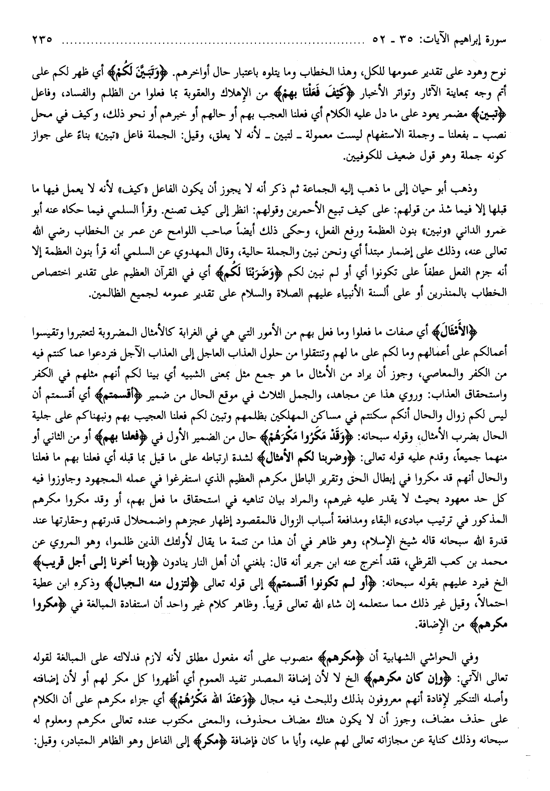 وذهب أبو حيان إلى ما ذهب إليه الجماعة ثم ذكر أنه لا يجوز أن يكون الفاعل «كيف» لأنه لا يعمل فيها ما قبلها إلا فيما شذ من قولهم: على كيف تبيع الأحمرين وقولهم: انظر إلى كيف تصنع. وقرأ السلمي فيما حكاه عنه أبو عمرو الداني «ونبين» بنون العظمة ورفع الفعل، وحكى ذلك أيضا صاحب اللوامح عن عمر بن الخطاب رضي الله تعالى عنه، وذلك على إضمار مبتدأ أي ونحن نبين والجملة حالية، وقال المهدوي عن السلمي أنه قرأ بنون العظمة إلا أنه جزم الفعل عطفا على تكونوا أي أو لم نبين لكم وَضَرَبْنا لَكُمُ أي في القرآن العظيم على تقدير اختصاص الخطاب بالمنذرين أو على ألسنة الأنبياء عليهم الصلاة والسلام على تقدير عمومه لجميع الظالمين.