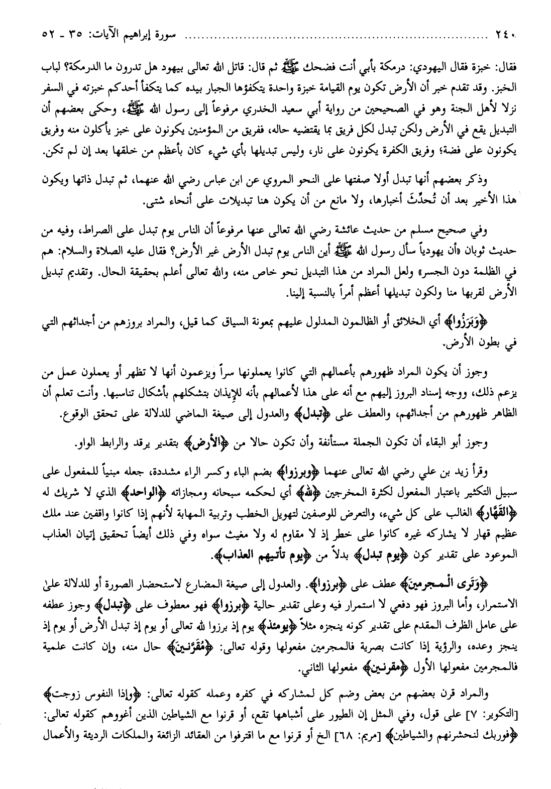 ولعل المراد من هذا التبديل نحو خاص منه، والله تعالى أعلم بحقيقة الحال. وتقديم تبديل الأرض لقربها منا ولكون تبديلها أعظم أمرا بالنسبة إلينا.