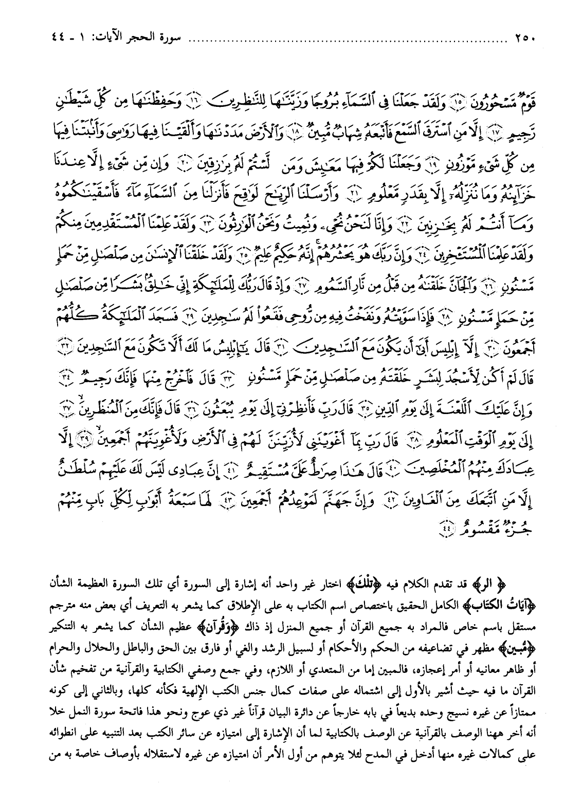 الر قد تقدم الكلام فيه تِلْكَ اختار غير واحد أنه إشارة إلى السورة أي تلك السورة العظيمة الشأن آياتُ الْكِتابِ الكامل الحقيق باختصاص اسم الكتاب به على الإطلاق كما يشعر به التعريف أي بعض منه مترجم مستقل باسم خاص فالمراد به جميع القرآن أو جميع المنزل إذ ذاك وَقُرْآنٍ عظيم الشأن كما يشعر به التنكير مُبِينٍ مظهر في تضاعيفه من الحكم والأحكام أو لسبيل الرشد والغي أو فارق بين الحق والباطل والحلال والحرام أو ظاهر معانيه أو أمر إعجازه، فالمبين إما من المتعدي أو اللازم، وفي جمع وصفي الكتابية والقرآنية من تفخيم شأن القرآن ما فيه حيث أشير بالأول إلى اشتماله على صفات كمال جنس الكتب الإلهية فكأنه كلها، وبالثاني إلى كونه ممتازا عن غيره نسيج وحده بديعا في بابه خارجا عن دائرة البيان قرآنا غير ذي عوج ونحو هذا فاتحة سورة النمل خلا أنه أخر هاهنا الوصف بالقرآنية عن الوصف بالكتابية لما أن الإشارة إلى امتيازه عن سائر الكتب بعد التنبيه على انطوائه على كمالات غيره منها أدخل في المدح لئلا يتوهم من أول الأمر أن امتيازه عن غيره لاستقلاله بأوصاف خاصة به من