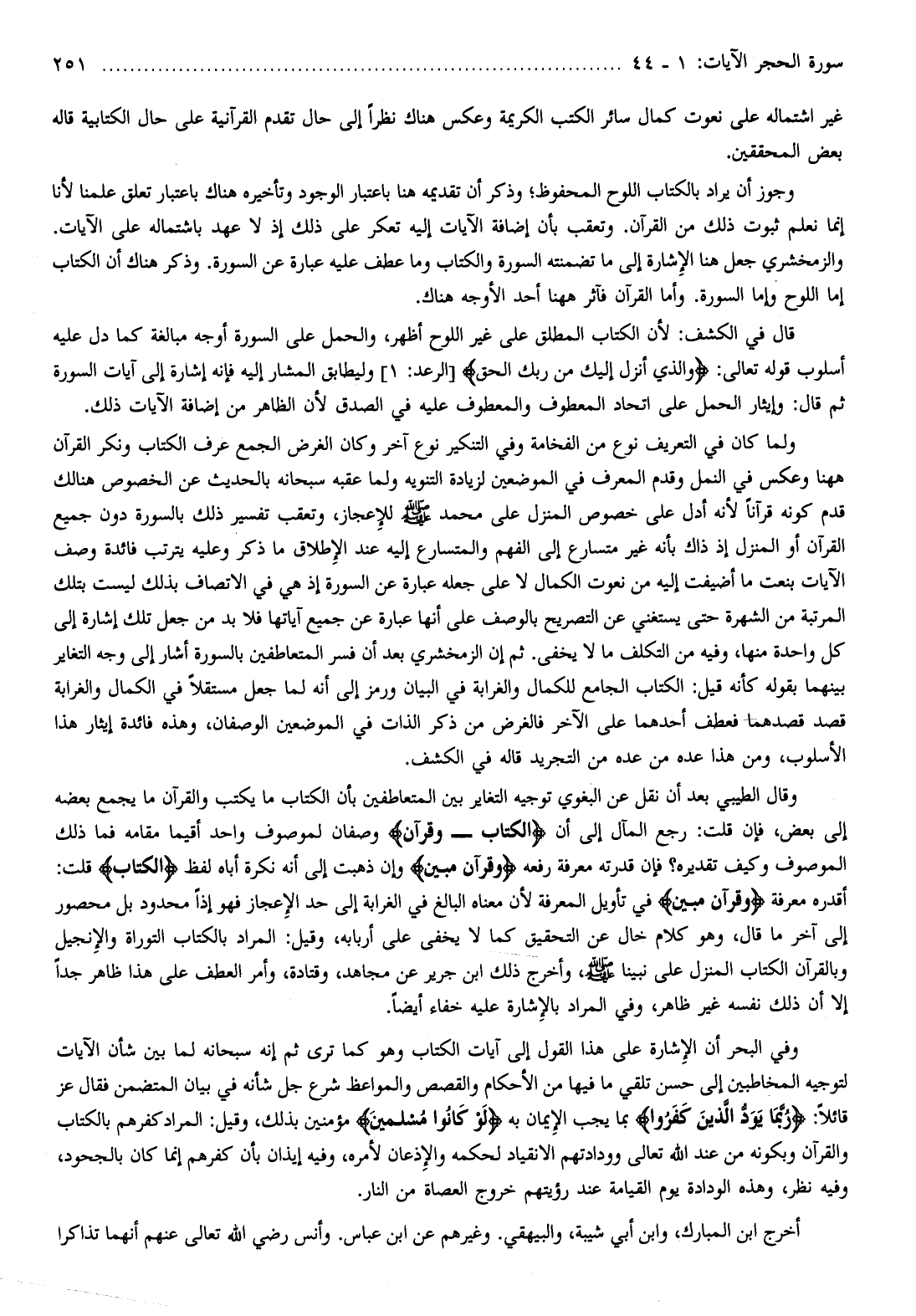 وقال الطيبي بعد أن نقل عن البغوي توجيه التغاير بين المتعاطفين بأن الكتاب ما يكتب والقرآن ما يجمع بعضه إلى بعض، فإن قلت: رجع المآل إلى أن الْكِتابِ- وَقُرْآنٍ وصفان لموصوف واحد أقيما مقامه فما ذلك الموصوف وكيف تقديره؟ فإن قدرته معرفة رفعه وَقُرْآنٍ مُبِينٍ وإن ذهبت إلى أنه نكرة أباه لفظ الْكِتابِ قلت: