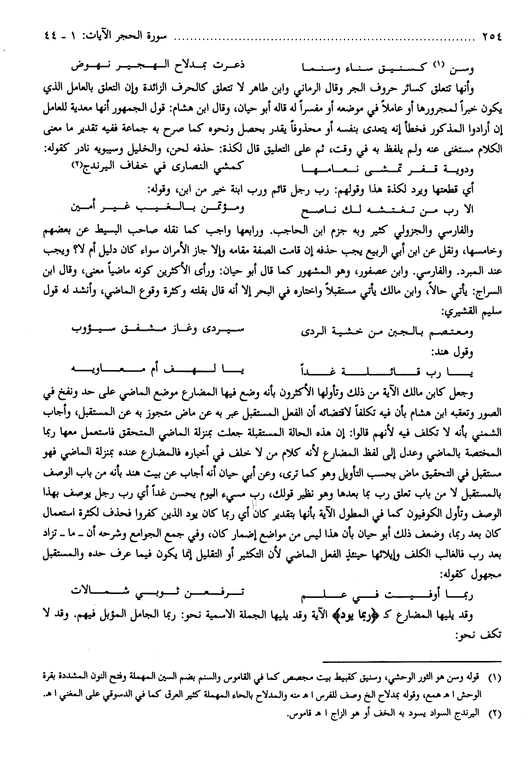 وجعل كابن مالك الآية من ذلك وتأولها الأكثرون بأنه وضع فيها المضارع موضع الماضي على حد ونفخ في الصور وتعقبه ابن هشام بأن فيه تكلفا لاقتضائه أن الفعل المستقبل عبر به عن ماض متجوز به عن المستقبل، وأجاب الشمني بأنه لا تكلف فيه لأنهم قالوا: إن هذه الحالة المستقبلة جعلت بمنزلة الماضي المتحقق فاستعمل معها ربما المختصة بالماضي وعدل إلى لفظ المضارع لأنه كلام من لا خلف في أخباره فالمضارع عنده بمنزلة الماضي فهو مستقبل في التحقيق ماض بحسب التأويل وهو كما ترى، وعن أبي حيان أنه أجاب عن بيت هند بأنه من باب الوصف بالمستقبل لا من باب تعلق رب بما بعدها وهو نظير قولك، رب مسيء اليوم يحسن غدا أي رب رجل يوصف بهذا الوصف وتأول الكوفيون كما في المطول الآية بأنها بتقدير كان أي ربما كان يود الذين كفروا فحذف لكثرة استعمال كان بعد ربما، وضعف ذلك أبو حيان بأن هذا ليس من مواضع إضمار كان، وفي جمع الجوامع وشرحه أن- ما- تزاد بعد رب فالغالب الكلف وإيلائها حينئذ الفعل الماضي لأن التكثير أو التقليل إنما يكون فيما عرف حده والمستقبل مجهول كقوله: