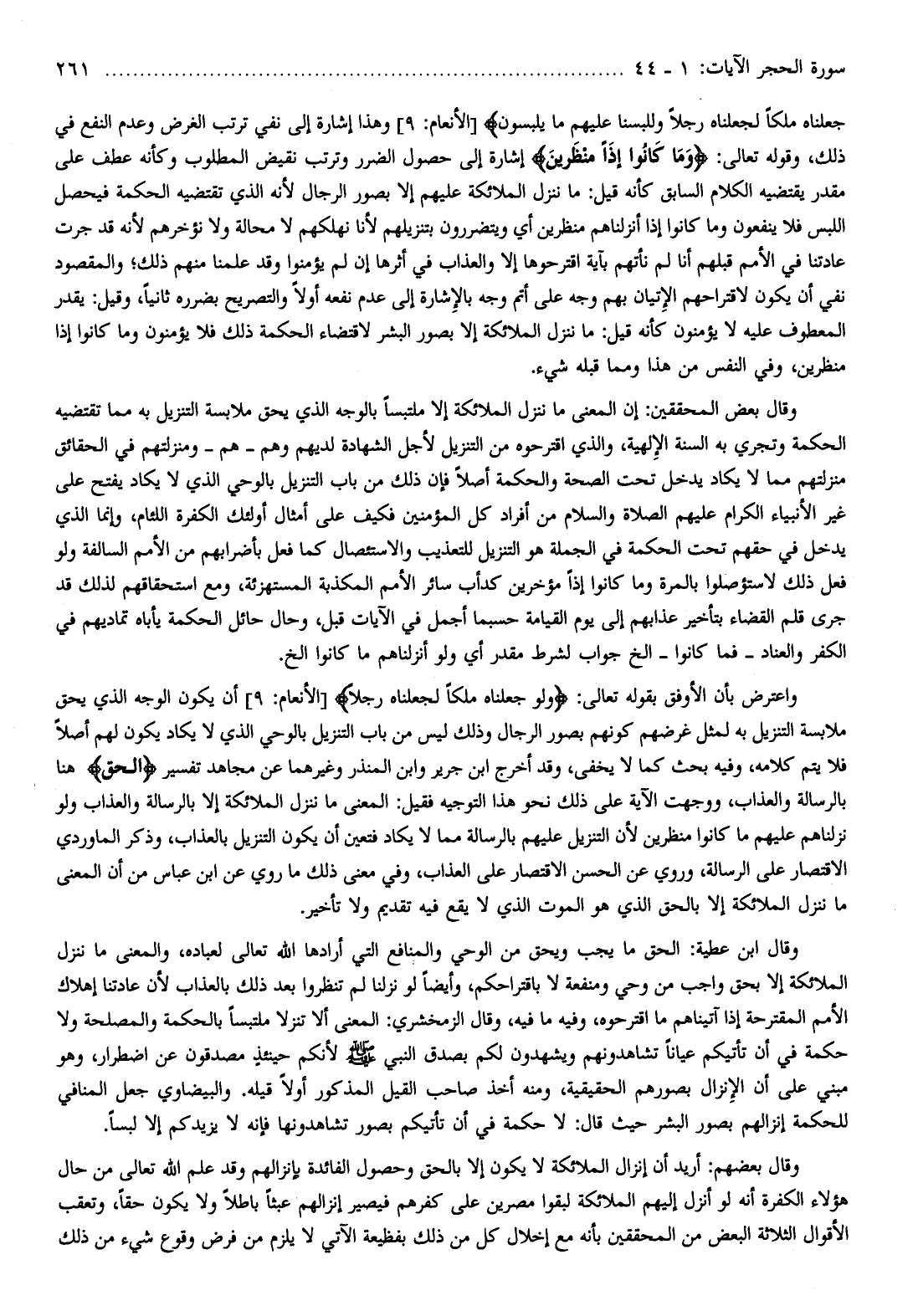 وقال ابن عطية: الحق ما يجب ويحق من الوحي والمنافع التي أرادها الله تعالى لعباده، والمعنى ما ننزل الملائكة إلا بحق واجب من وحي ومنفعة لا باقتراحكم، وأيضا لو نزلنا لم تنظروا بعد ذلك بالعذاب لأن عادتنا إهلاك الأمم المقترحة إذا آتيناهم ما اقترحوه، وفيه ما فيه، وقال الزمخشري: المعنى ألا تنزلا ملتبسا بالحكمة والمصلحة ولا حكمة في أن تأتيكم عيانا تشاهدونهم ويشهدون لكم بصدق النبي صلى الله عليه وسلم لأنكم حينئذ مصدقون عن اضطرار، وهو مبني على أن الإنزال بصورهم الحقيقة، ومنه أخذ صاحب القيل المذكور أولا قيله. والبيضاوي جعل المنافي للحكمة إنزالهم بصور البشر حيث قال: لا حكمة في أن تأتيكم بصور تشاهدونها فإنه لا يزيدكم إلا لبسا.