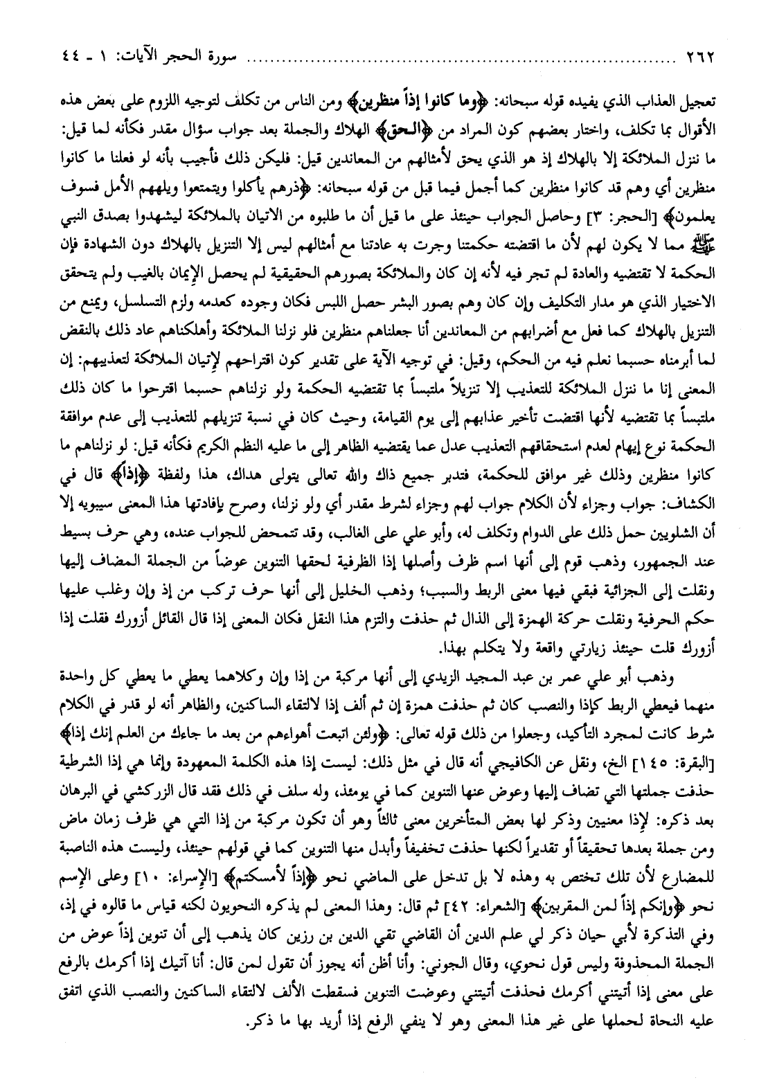 ما ننزل الملائكة إلا بالهلاك إذ هو الذي يحق لأمثالهم من المعاندين قيل: فليكن ذلك فأجيب بأنه لو فعلنا ما كانوا منظرين أي وهم قد كانوا منظرين كما أجمل فيما قبل من قوله سبحانه: ذَرْهُمْ يَأْكُلُوا وَيَتَمَتَّعُوا وَيُلْهِهِمُ الْأَمَلُ فَسَوْفَ يَعْلَمُونَ [الحجر: 3] وحاصل الجواب حينئذ على ما قيل أن ما طلبوه من الإتيان بالملائكة ليشهدوا بصدق النبي صلى الله عليه وسلم مما لا يكون لهم لأن ما اقتضته حكمتنا وجرت به عادتنا مع أمثالهم ليس إلا التنزيل بالهلاك دون الشهادة فإن الحكمة لا تقتضيه والعادة لم تجر فيه لأنه إن كان والملائكة بصورهم الحقيقية لم يحصل الإيمان بالغيب ولم يتحقق الاختيار الذي هو مدار التكليف وإن كان وهم بصور البشر حصل اللبس فكان وجوده كعدمه ولزم التسلسل، ويمنع من التنزيل بالهلاك كما فعل مع أضرابهم من المعاندين أنا جعلناهم منظرين فلو نزلنا الملائكة وأهلكناهم عاد ذلك بالنقض لما أبرمناه حسبما نعلم فيه من الحكم، وقيل: في توجيه الآية على تقدير كون اقتراحهم لإتيان الملائكة لتعذيبهم: إن المعنى إنا ما ننزل الملائكة للتعذيب إلا تنزيلا ملتبسا بما تقتضيه الحكمة ولو نزلناهم حسبما اقترحوا ما كان ذلك ملتبسا بما تقتضيه لأنها اقتضت تأخير عذابهم إلى يوم القيامة، وحيث كان في نسبة تنزيلهم للتعذيب إلى عدم موافقة الحكمة نوع إيهام لعدم استحقاقهم التعذيب عدل عما يقتضيه الظاهر إلى ما عليه النظم الكريم فكأنه قيل: لو نزلناهم ما كانوا منظرين وذلك غير موافق للحكمة، فتدبر جميع ذاك والله تعالى يتولى هداك، هذا ولفظة إِذاً قال في الكشاف: جواب وجزاء لأن الكلام جواب لهم وجزاء لشرط مقدر أي ولو نزلنا، وصرح بإفادتها هذا المعنى سيبويه إلا أن الشلوبيين حمل ذلك على الدوام وتكلف له، وأبو علي على الغالب، وقد تتمحض للجواب عنده، وهي حرف بسيط عند الجمهور، وذهب قوم إلى أنها اسم ظرف وأصلها إذا الظرفية لحقها التنوين عوضا من الجملة المضاف إليها ونقلت إلى الجزائية فبقي فيها معنى الربط والسبب وذهب الخليل إلى أنها حرف تركب من إذ وإن وغلب عليها حكم الحرفية ونقلت حركة الهمزة إلى الذال ثم حذفت والتزم هذا النقل فكان المعنى إذا قال القائل أزورك فقلت إذا أزورك قلت حينئذ زيارتي واقعة ولا يتكلم بهذا.