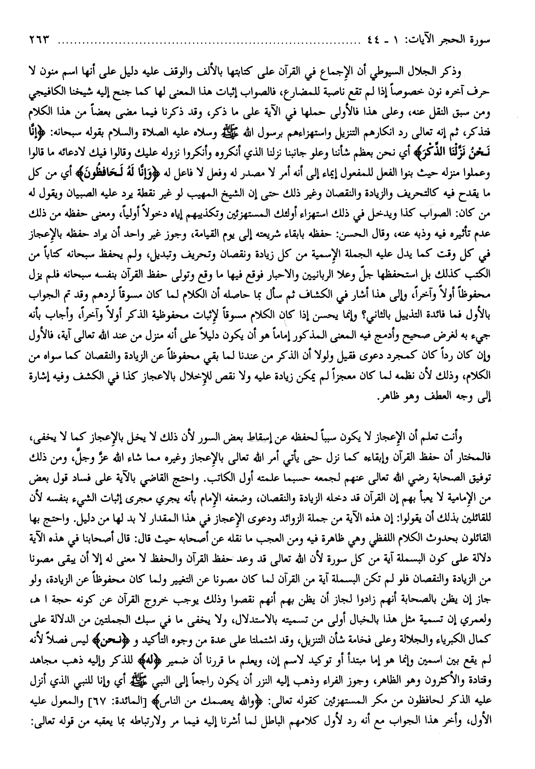 وأنت تعلم أن الإعجاز لا يكون سببا لحفظه عن إسقاط بعض السور لأن ذلك لا يخل بالإعجاز كما لا يخفى، فالمختار أن حفظ القرآن وإبقاءه كما نزل حتى يأتي أمر الله تعالى بالإعجاز وغيره مما شاء الله عزّ وجلّ، ومن ذلك توفيق الصحابة رضي الله تعالى عنهم لجمعه حسبما علمته أول الكاتب. واحتج القاضي بالآية على فساد قول بعض من الإمامية لا يعبأ بهم إن القرآن قد دخله الزيادة والنقصان، وضعفه الإمام بأنه يجري مجرى إثبات الشيء بنفسه لأن للقائلين بذلك أن يقولوا: إن هذه الآية من جملة الزوائد ودعوى الإعجاز في هذا المقدار لا بد لها من دليل. واحتج بها القائلون بحدوث الكلام اللفظي وهي ظاهرة فيه ومن العجب ما نقله عن أصحابه حيث قال: قال أصحابنا في هذه الآية دلالة على كون البسملة آية من كل سورة لأن الله تعالى قد وعد حفظ القرآن والحفظ لا معنى له إلا أن يبقى مصونا من الزيادة والنقصان فلو لم تكن البسملة آية من القرآن لما كان مصونا عن التغيير ولما كان محفوظا عن الزيادة، ولو جاز إن يظن بالصحابة أنهم زادوا لجاز أن يظن بهم أنهم نقصوا وذلك يوجب خروج القرآن عن كونه حجة اه، ولعمري إن تسمية مثل هذا بالخبال أولى من تسميته بالاستدلال، ولا يخفى ما في سبك الجملتين من الدلالة على كمال الكبرياء والجلالة وعلى فخامة شأن التنزيل، وقد اشتملتا على عدة من وجوه التأكيد ونَحْنُ ليس فصلا لأنه لم يقع بين اسمين وإنما هو إما مبتدأ أو توكيد لاسم إن، ويعلم ما قررنا أن ضمير لَهُ للذكر وإليه ذهب مجاهد وقتادة والأكثرون وهو الظاهر، وجوز الفراء وذهب إليه النزر أن يكون راجعا إلى النبي صلى الله عليه وسلم أي وإنا للنبي الذي أنزل عليه الذكر لحافظون من مكر المستهزئين كقوله تعالى: وَاللَّهُ يَعْصِمُكَ مِنَ النَّاسِ [المائدة: 67] والمعول عليه الأول، وأخر هذا الجواب مع أنه رد لأول كلامهم الباطل لما أشرنا إليه فيما مر ولارتباطه بما يعقبه من قوله تعالى: