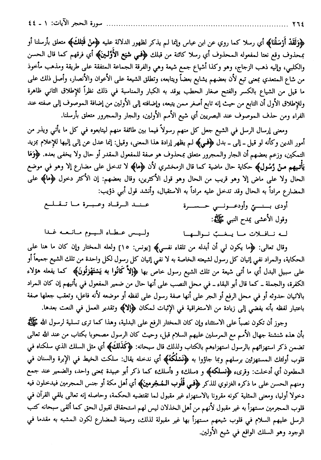 ومعنى إرسال الرسل في الشيع جعل كل منهم رسولا فيما بين طائفة منهم ليتابعوه في كل ما يأتي ويذر من أمور الدين وكأنه لو قيل- إلى- بدل فِي لم يظهر إرادة هذا المعنى، وقيل: إنما عدل عن إلى إليها للإعلام بمزيد التمكين، وزعم بعضهم أن الجار والمجرور متعلق بمحذوف هو صفة للمفعول المقدر أو حال ولا يخفى بعده. وَما يَأْتِيهِمْ مِنْ رَسُولٍ حكاية حال ماضية كما قال الزمخشري لأن ما لا تدخل على مضارع إلا وهو في موضع الحال ولا على ماض إلا وهو قريب من الحال وهو قول الأكثرين، وقال بعضهم: إن الأكثر دخول ما على المضارع مرادا به الحال وقد تدخل عليه مرادا به الاستقبال، وأنشد قول أبي ذؤيب: