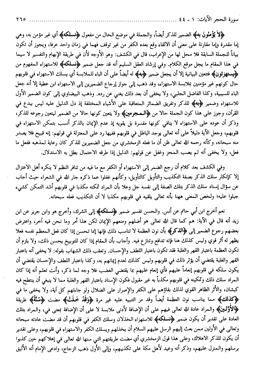 نعم أخرج ابن أبي حاتم عن أنس. والحسن تفسير ضمير نَسْلُكُهُ إلى الشرك، وأخرج هو وابن جرير عن ابن زيد أنه قال في الآية: هم كما قال الله تعالى هو أضلهم ومنعهم الإيمان لكن هذا أمر وما نحن فيه آخر، واعترض بعضهم رجوع الضمير إلى الذِّكْرَ بأن نون العظمة لا تناسب ذلك فإنها إنما تحسن إذا كان فعل المعظم نفسه فعلا يظهر له أثر قوي وليس كذلك هنا فإنه تدافع وتنازع فيه. وأجاب بأن المقام إذا كان للتوبيخ يحسن ذلك، ولا يلزم أن تكون العظمة باعتبار القهر والغلبة فقد تكون باعتبار اللطف والإحسان. وتعقب ذلك الشهاب بقوله: لا يخفى أنه باعتبار القهر والغلبة يقتضي أن يؤثر ذلك في قلوبهم وليس كذلك لعدم إيمانهم به، وكذا باعتبار اللطف والإحسان يقتضي أن يكون سلكه في قلوبهم إنعاما عليهم فأي إنعام عليهم بما يقتضي الغضب فلا وجه لما ذكر، وأنت تعلم أنه إذا كان المراد سلك ذلك وتمكينه في قلوبهم مكذبا به غير مقبول فكون الإسناد باعتبار القهر والغلبة مما لا ينبغي أن ينتطح فيه كبشان، والأثر الظاهر القوي لذلك بقاؤهم على الكفر والإصرار على الضلال ولو جاءتهم كل آية، ولا يخفى ما في كَذلِكَ مما يناسب نون العظمة أيضا وقد مر التنبيه عليه غير مرة وَقَدْ خَلَتْ مضت سُنَّةُ طريقة الْأَوَّلِينَ والمراد عادة الله تعالى فيهم على أن الإضافة لأدنى ملابسة لا على أن الإضافة بمعنى في، والمراد بتلك العادة على تقدير أن يكون ضمير نَسْلُكُهُ للاستهزاء الخذلان وسلك الكفر في قلوبهم أن قد مضت عادته سبحانه وتعالى في الأولين ممن بعث إليهم الرسل عليهم السلام أن يخذلهم ويسلك الكفر والاستهزاء في قلوبهم، وعلى تقدير أن يكون للذكر الإهلاك، وعلى هذا قول الزمخشري أي مضت طريقتهم التي سنها الله تعالى في إهلاكهم حين كذبوا برسلهم والمنزل عليهم، وذكر أنه وعيد لأهل مكة على تكذيبهم، وإلى الأول ذهب الزجاج، وادعى الإمام أنه الأليق