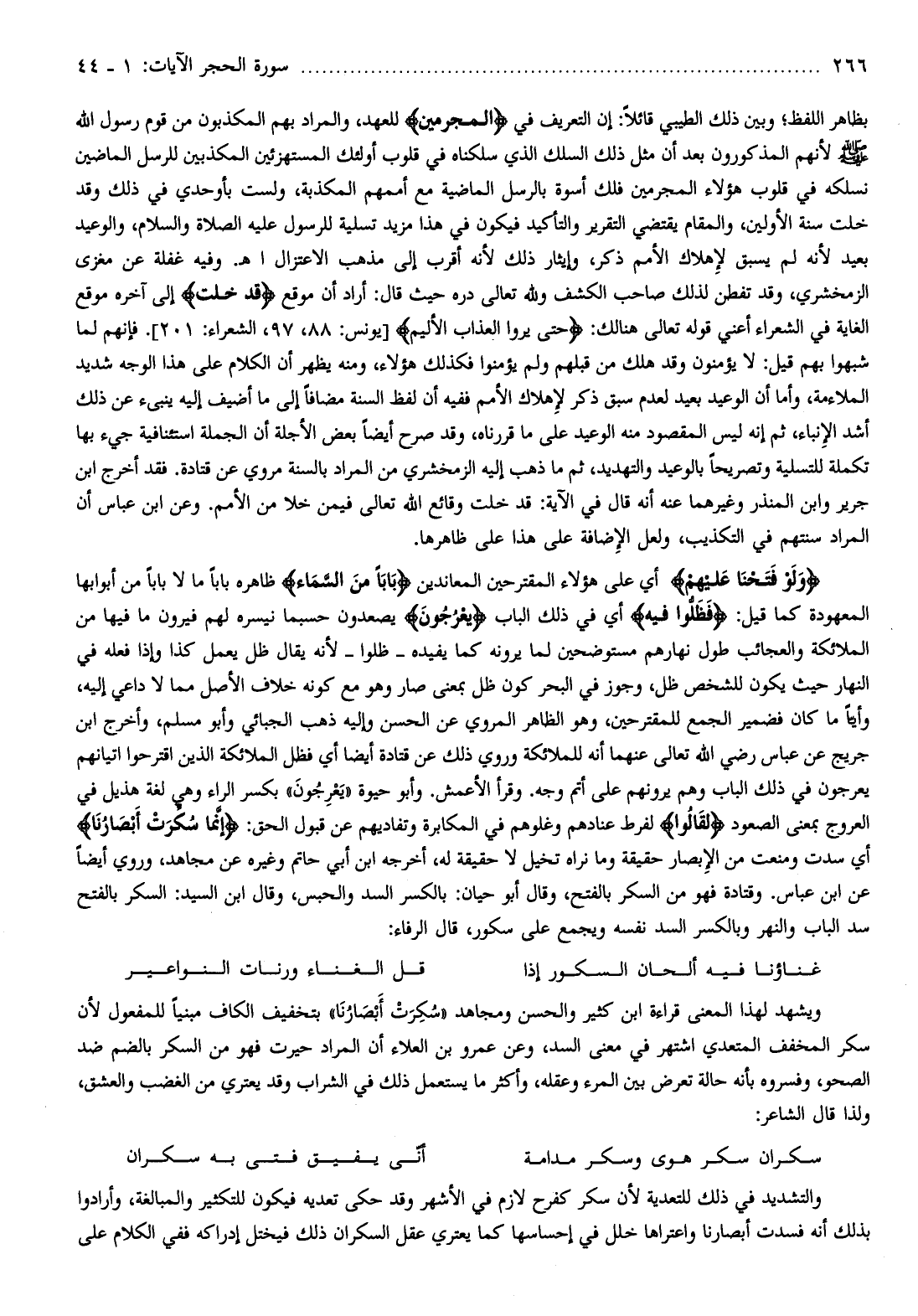 ويشهد لهذا المعنى قراءة ابن كثير والحسن ومجاهد «سكرت أبصارنا» بتخفيف الكاف مبنيا للمفعول لأن سكر المخفف المتعدي اشتهر في معنى السد، وعن عمرو بن العلاء أن المراد حيرت فهو من السكر بالضم ضد الصحو، وفسروه بأنه حالة تعرض بين المرء وعقله، وأكثر ما يستعمل ذلك في الشراب وقد يعتري من الغضب والعشق، ولذا قال الشاعر: