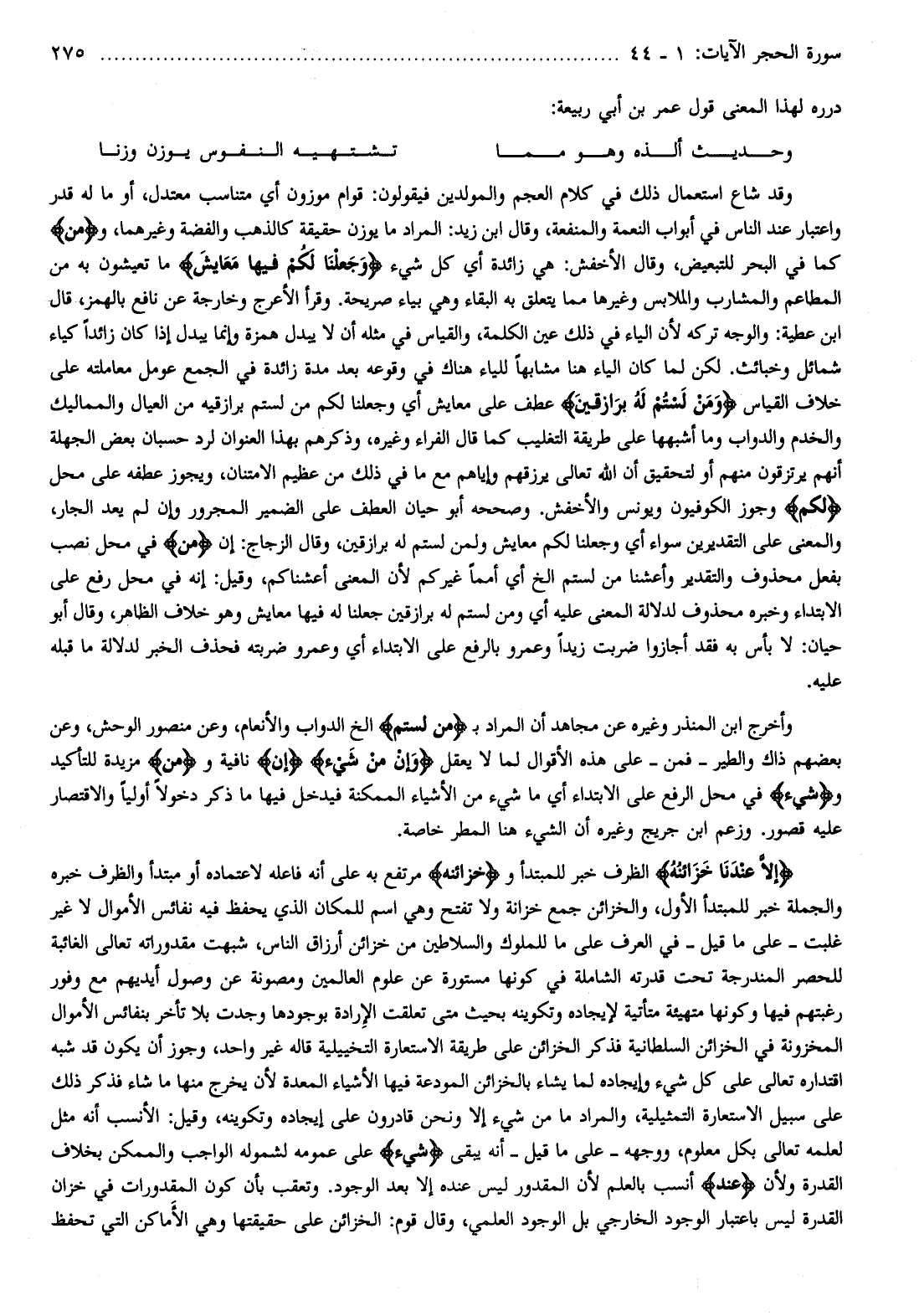 وقد شاع استعمال ذلك في كلام العجم والمولدين فيقولون: قوام موزون أي متناسب معتدل، أو ما له قدر واعتبار عند الناس في أبواب النعمة والمنفعة، وقال ابن زيد: المراد ما يوزن حقيقة كالذهب والفضة وغيرهما، ومِنْ كما في البحر للتبعيض، وقال الأخفش: هي زائدة أي كل شيء وَجَعَلْنا لَكُمْ فِيها مَعايِشَ ما تعيشون به من المطاعم والمشارب والملابس وغيرها مما يتعلق به البقاء وهي بياء صريحة. وقرأ الأعرج وخارجة عن نافع بالهمز، قال ابن عطية: والوجه تركه لأن الياء في ذلك عين الكلمة، والقياس في مثله أن لا يبدل همزة وإنما يبدل إذا كان زائدا كياء شمائل وخبائث. لكن لما كان الياء هنا مشابها للياء هناك في وقوعه بعد مدة زائدة في الجمع عومل معاملته على خلاف القياس وَمَنْ لَسْتُمْ لَهُ بِرازِقِينَ عطف على معايش أي وجعلنا لكم من لستم برازقيه من العيال والمماليك والخدم والدواب وما أشبهها على طريقة التغليب كما قال الفراء وغيره، وذكرهم بهذا العنوان لرد حسبان بعض الجهلة أنهم يرتزقون منهم أو لتحقيق أن الله تعالى يرزقهم وإياهم مع ما في ذلك من عظيم الامتنان، ويجوز عطفه على محل لَكُمْ وجوز الكوفيون ويونس والأخفش. وصححه أبو حيان العطف على الضمير المجرور وإن لم يعد الجار، والمعنى على التقديرين سواء أي وجعلنا لكم معايش ولمن لستم له برازقين، وقال الزجاج: إن مَنْ في محل نصب بفعل محذوف والتقدير وأعشنا من لستم إلخ أي أمما غيركم لأن المعنى أعشناكم، وقيل: إنه في محل رفع على الابتداء وخبره محذوف لدلالة المعنى عليه أي ومن لستم له برازقين جعلنا له فيها معايش وهو خلاف الظاهر، وقال أبو حيان: لا بأس به فقد أجازوا ضربت زيدا وعمرو بالرفع على الابتداء أي وعمرو ضربته فحذف الخبر لدلالة ما قبله عليه.