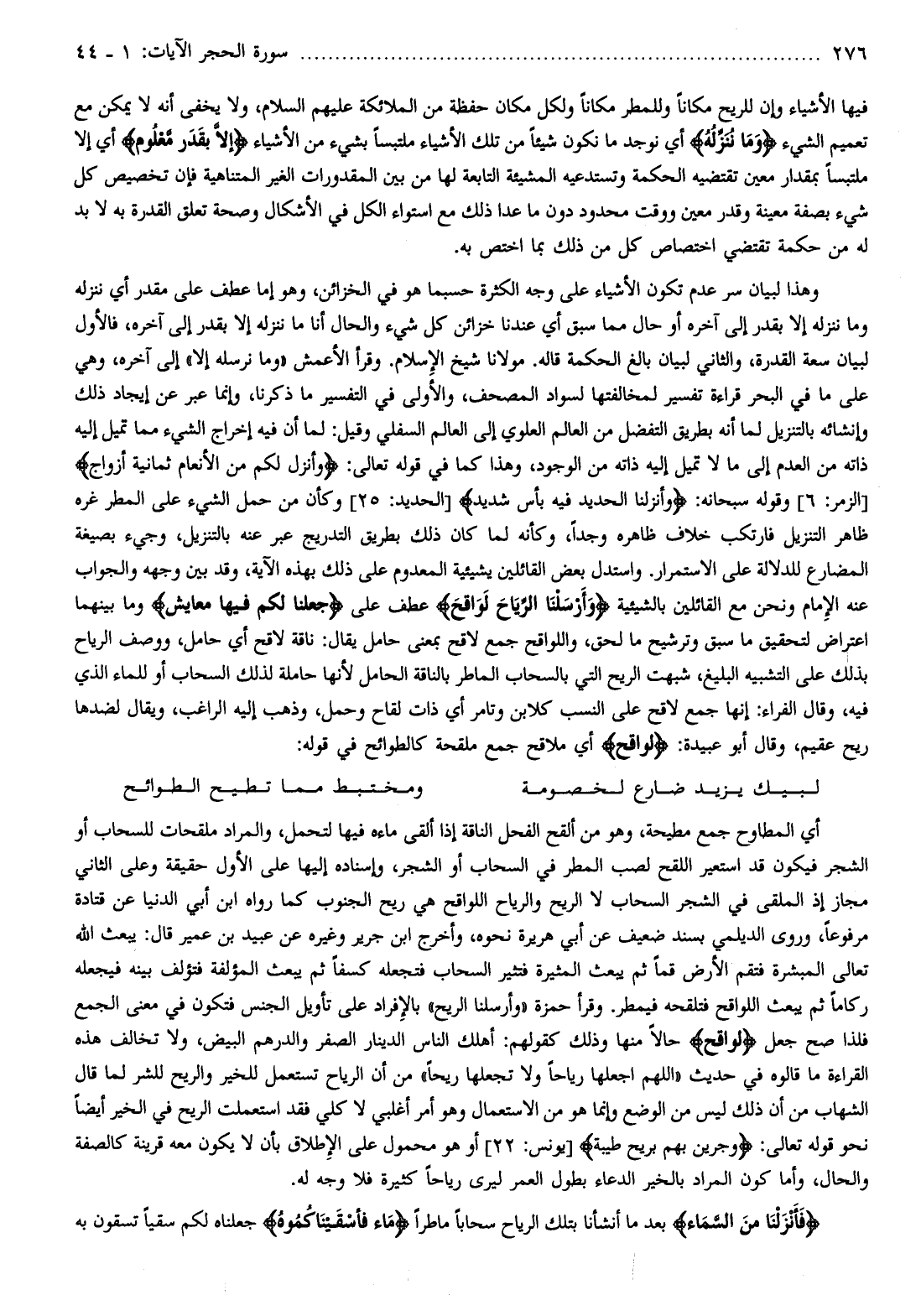 [الزمر: 6] وقوله سبحانه: وَأَنْزَلْنَا الْحَدِيدَ فِيهِ بَأْسٌ شَدِيدٌ [الحديد: 25] وكأن من حمل الشيء على المطر غره ظاهر التنزيل فارتكب خلاف ظاهره وجدا، وكأنه لما كان ذلك بطريق التدريج عبر عنه بالتنزيل، وجيء بصيغة المضارع للدلالة على الاستمرار. واستدل بعض القائلين يشيئية المعدوم على ذلك بهذه الآية، وقد بين وجهه والجواب عنه الإمام ونحن مع القائلين بالشيئية وَأَرْسَلْنَا الرِّياحَ لَواقِحَ عطف على جَعَلْنا لَكُمْ فِيها مَعايِشَ وما بينهما اعتراض لتحقيق ما سبق وترشيح ما لحق، واللواقح جمع لاقح بمعنى حامل يقال: ناقة لاقح أي حامل، ووصف الرياح بذلك على التشبيه البليغ، شبهت الريح التي بالسحاب الماطر بالناقة الحامل لأنها حاملة لذلك السحاب أو للماء الذي فيه، وقال الفراء: إنها جمع لاقح على النسب كلابن وتامر أي ذات لقاح وحمل، وذهب إليه الراغب، ويقال لضدها ريح عقيم، وقال أبو عبيدة: لَواقِحَ أي ملاقح جمع ملقحة كالطوائح في قوله: