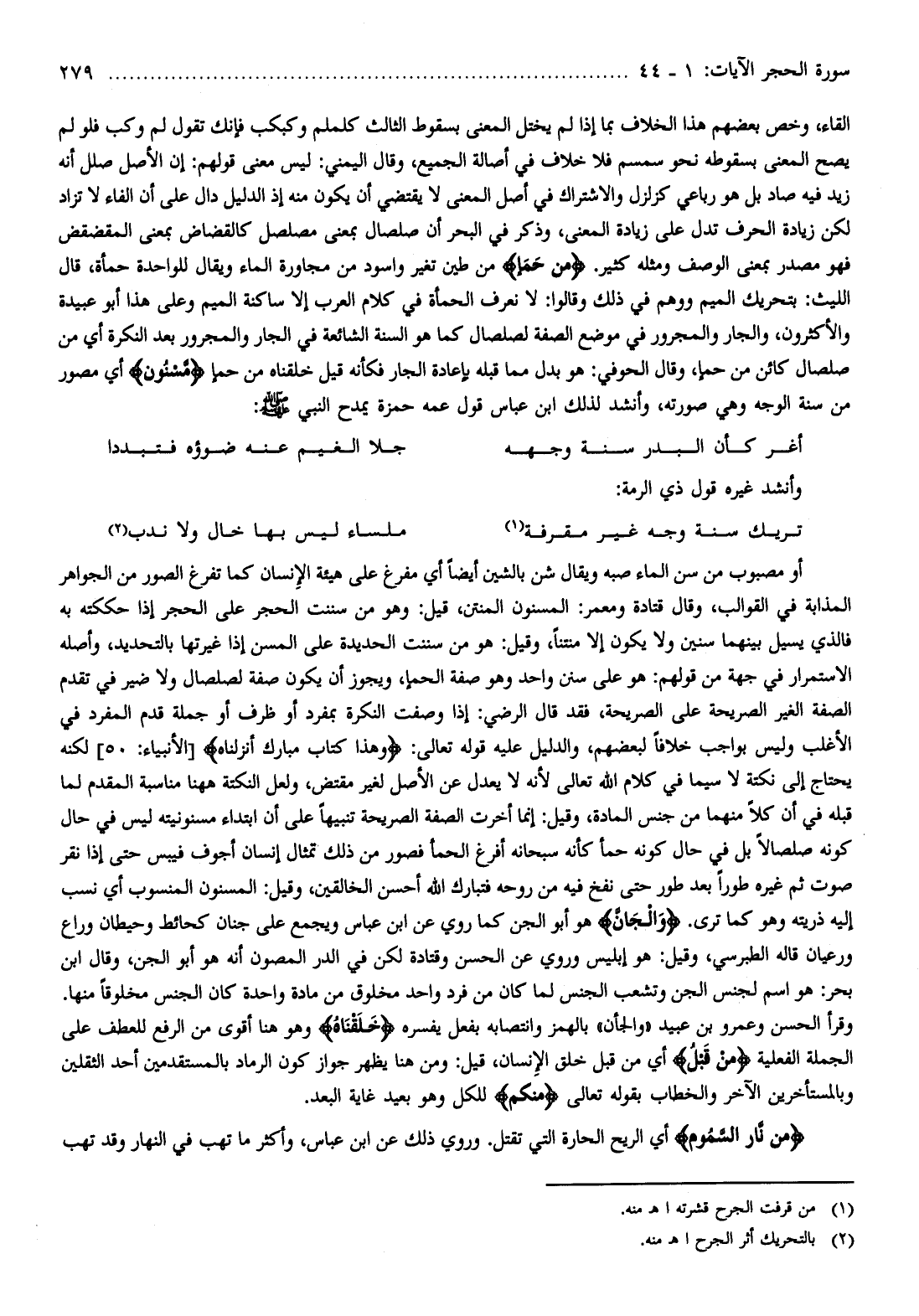 إلقاء، وخص بعضهم هذا الخلاف بما إذا لم يختل المعنى بسقوط الثالث كلملم وكبكب فإنك تقول لم وكب فلو لم يصح المعنى بسقوطه نحو سمسم فلا خلاف في أصالة الجميع، وقال اليمني: ليس معنى قولهم: إن الأصل صلل أنه زيد فيه صاد بل هو رباعي كزلزل والاشتراك في أصل المعنى لا يقتضي أن يكون منه إذ الدليل دال على أن الفاء لا تزاد لكن زيادة الحرف تدل على زيادة المعنى، وذكر في البحر أن صلصال بمعنى مصلصل كالقضاض بمعنى المقضقض فهو مصدر بمعنى الوصف ومثله كثير. مِنْ حَمَإٍ من طين تغير واسود من مجاورة الماء ويقال للواحدة حمأة، قال الليث: بتحريك الميم ووهم في ذلك وقالوا: لا نعرف الحمأة في كلام العرب إلا ساكنة الميم وعلى هذا أبو عبيدة والأكثرون، والجار والمجرور في موضع الصفة لصلصال كما هو السنة الشائعة في الجار والمجرور بعد النكرة أي من صلصال كائن من حمإ، وقال الحوفي: هو بدل مما قبله بإعادة الجار فكأنه قيل خلقناه من حمإ مَسْنُونٍ أي مصور من سنة الوجه وهي صورته، وأنشد لذلك ابن عباس قول عمه حمزة يمدح النبي صلى الله عليه وسلم: