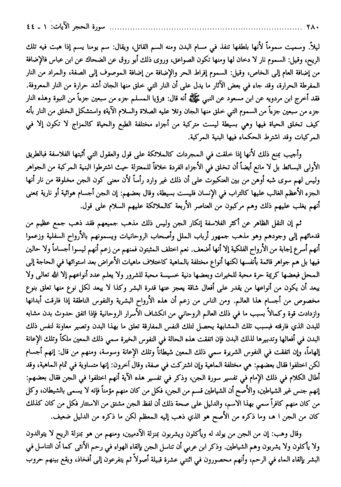 ثم إن النقل الظاهر عن أكثر الفلاسفة إنكار الجن وليس ذلك مذهب جميعهم فقد ذهب جمع عظيم من قدمائهم إلى وجودهم وهو مذهب جمهور أرباب الملل وأصحاب الروحانيات ويسمونهم بالأرواح السفلية وزعموا أنهم أسرع إجابة من الأرواح الفلكية إلا أنها أضعف. نعم اختلف المثبتون فمنهم من زعم أنهم ليسوا أجساما ولا حالين فيها بل هم جواهر قائمة بأنفسها لكنها أنواع مختلفة بالماهية كاختلاف ماهيات الأعراض بعد استوائها في الحاجة إلى المحل فبعضها كريمة حرة محبة للخيرات وبعضها دنية خسيسة محبة للشرور ولا يعلم عدد أنواعهم إلا الله تعالى ولا يبعد أن يكون من أنواعها من يقدر على أفعال شاقة يعجز عنها قدرة البشر وكذا لا يبعد لكل نوع منها تعلق بنوع مخصوص من أجسام هذا العالم. ومن الناس من زعم أن هذه الأرواح البشرية والنفوس الناطقة إذا فارقت أبدانها وازدادت قوة وكمالا بسبب ما في ذلك العالم الروحاني من انكشاف الأسرار الروحانية فإذا اتفق حدوث بدن مشابه للبدن الذي فارقته فبسبب تلك المشابهة يحصل لتلك النفس المفارقة تعلق ما بهذا البدن وتصير معاونة لنفس ذلك البدن في أفعالها وتدبيرها لذلك البدن فإن اتفقت هذه الحالة في النفوس الخيرة سمي ذلك المعين ملكا وتلك الإعانة إلهاما، وإن اتفقت في النفوس الشريرة سمي ذلك المعين شيطانا وتلك الإعانة وسوسة، ومنهم من قال: إنهم أجسام لكن اختلفوا فقال بعضهم: هي مختلفة الماهية وإن اشتركت في صفة، وقال آخرون: إنها متساوية في تمام الماهية، وقد أطال الكلام في ذلك الإمام في تفسير سورة الجن، وذكر في تفسير هذه الآية أنهم اختلفوا في الجن فقال بعضهم: