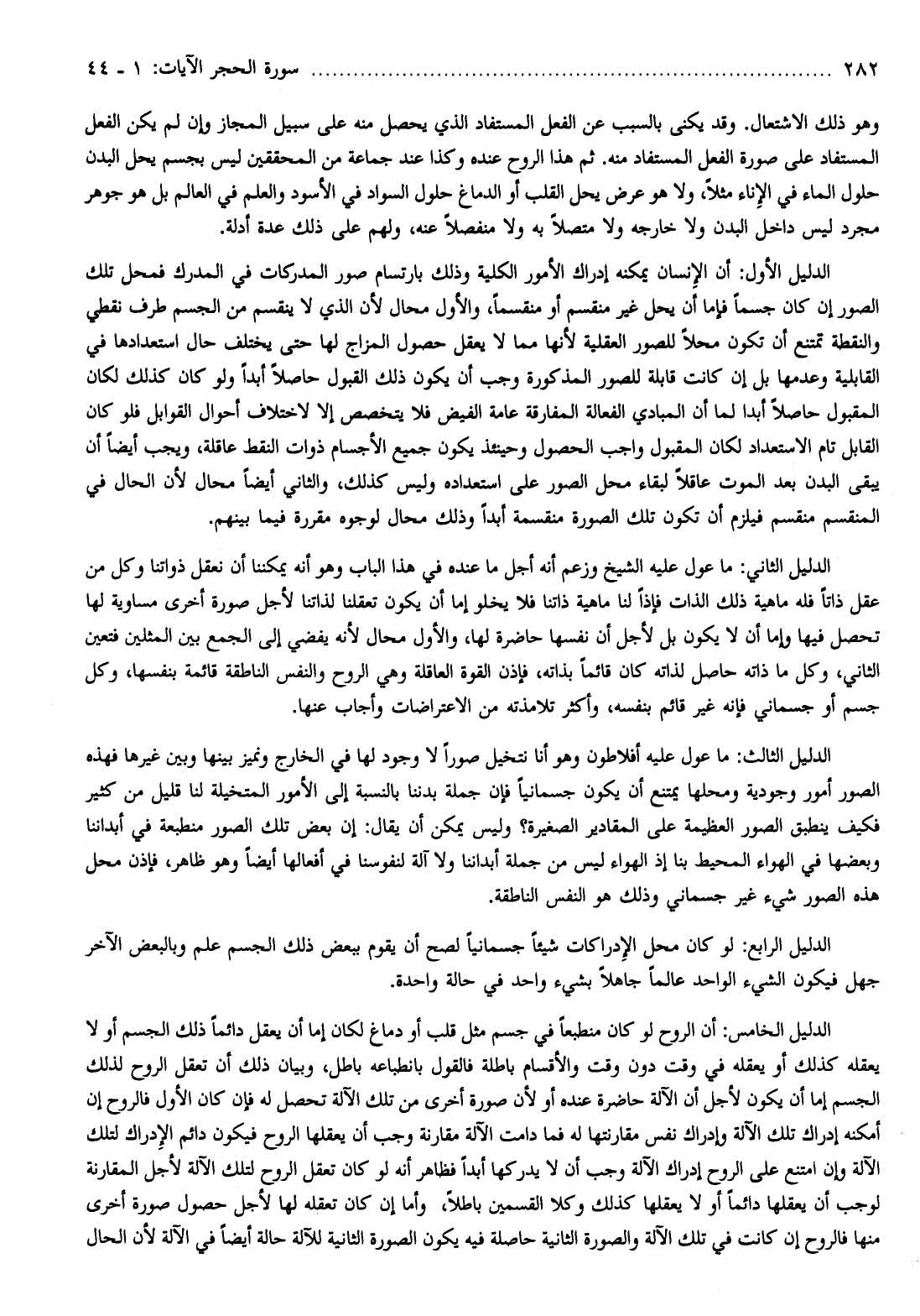 الدليل الأول: أن الإنسان يمكنه إدراك الأمور الكلية وذلك بارتسام صور المدركات في المدرك فمحل تلك الصور إن كان جسما فإما أن يحل غير منقسم أو منقسما، والأول محال لأن الذي لا ينقسم من الجسم طرف نقطي والنقطة تمتنع أن تكون محلا للصور العقلية لأنها مما لا يعقل حصول المزاج لها حتى يختلف حال استعدادها في القابلية وعدمها بل إن كانت قابلة للصور المذكورة وجب أن يكون ذلك القبول حاصلا أبدا ولو كان كذلك لكان المقبول حاصلا أبدا لما أن المبادي الفعالة المفارقة عامة الفيض فلا يتخصص إلا لاختلاف أحوال القوابل فلو كان القابل تام الاستعداد لكان المقبول واجب الحصول وحينئذ يكون جميع الأجسام ذوات النقط عاقلة، ويجب أيضا أن يبقى البدن بعد الموت عاقلا لبقاء محل الصور على استعداده وليس كذلك، والثاني أيضا محال لأن الحال في المنقسم منقسم فيلزم أن تكون تلك الصورة منقسمة أبدا وذلك محال لوجوه مقررة فيما بينهم.