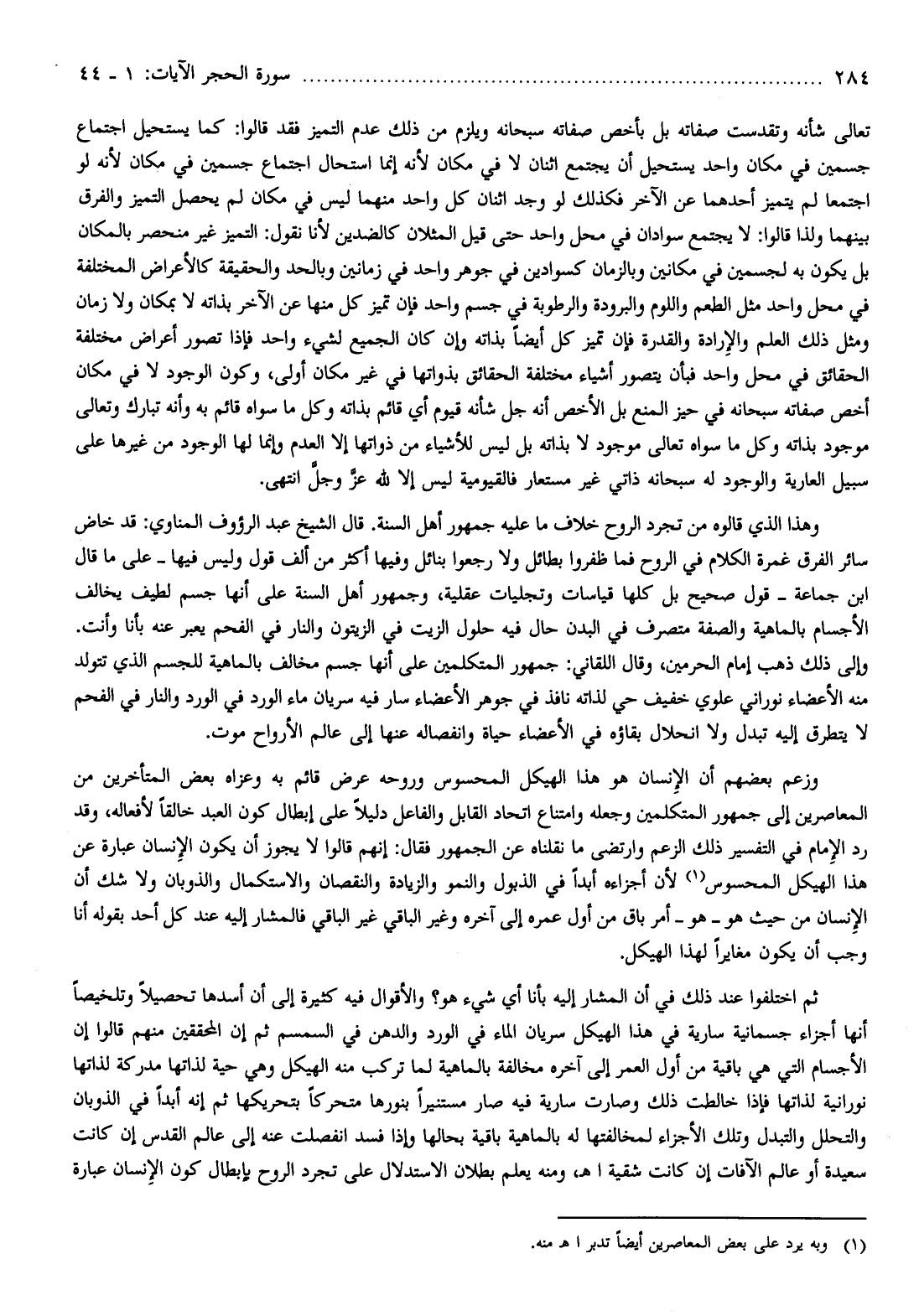 وهذا الذي قالوه من تجرد الروح خلاف ما عليه جمهور أهل السنة. قال الشيخ عبد الرؤوف المناوي: قد خاض سائر الفرق غمرة الكلام في الروح فما ظفروا بطائل ولا رجعوا بنائل وفيها أكثر من ألف قول وليس فيها- على ما قال ابن جماعة- قول صحيح بل كلها قياسات وتجليات عقلية، وجمهور أهل السنة على أنها جسم لطيف يخالف الأجسام بالماهية والصفة متصرف في البدن حال فيه حلول الزيت في الزيتون والنار في الفحم يعبر عنه بأنا وأنت.