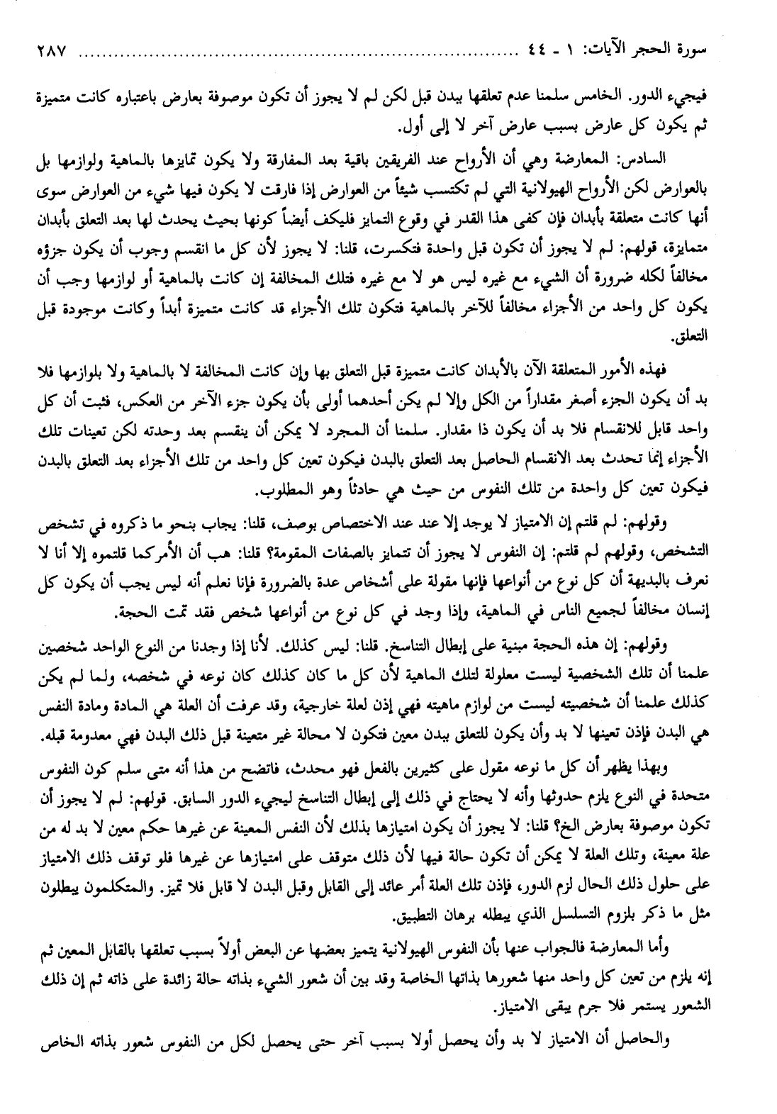 وقولهم: إن هذه الحجة مبنية على إبطال التناسخ. قلنا: ليس كذلك. لأنا إذا وجدنا من النوع الواحد شخصين علمنا أن تلك الشخصية ليست معلولة لتلك الماهية لأن كل ما كان كذلك كان نوعه في شخصه، ولما لم يكن كذلك علمنا أن شخصيته ليست من لوازم ماهيته فهي إذن لعلة خارجية، وقد عرفت أن العلة هي المادة ومادة النفس هي البدن فإذن تعينها لا بد وأن يكون للتعلق ببدن معين فتكون لا محالة غير متعينة قبل ذلك البدن فهي معدومة قبله.