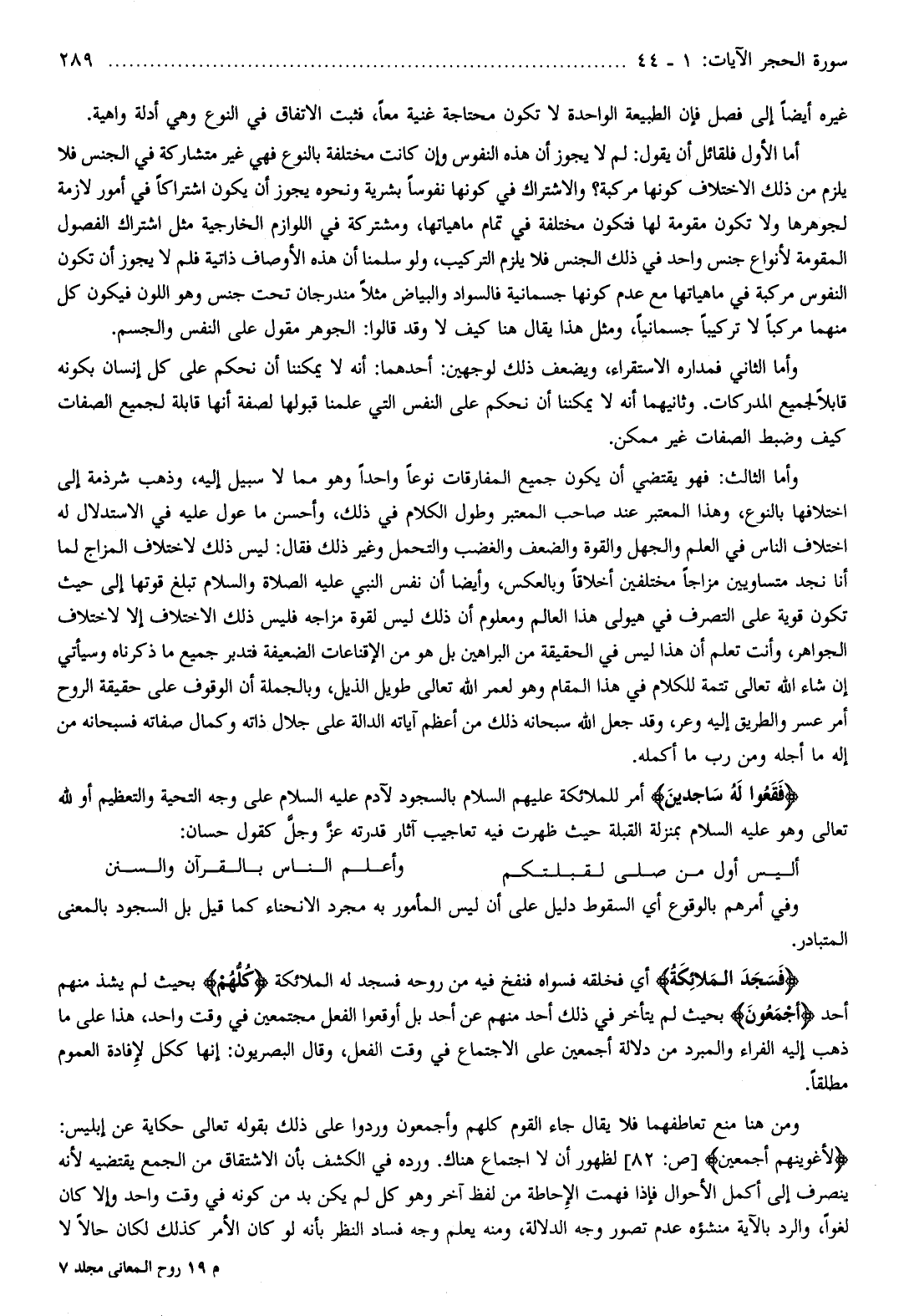 وأما الثالث: فهو يقتضي أن يكون جميع المفارقات نوعا واحدا وهو مما لا سبيل إليه، وذهب شرذمة إلى اختلافها بالنوع، وهذا المعتبر عند صاحب المعتبر وطول الكلام في ذلك، وأحسن ما عول عليه في الاستدلال له اختلاف الناس في العلم والجهل والقوة والضعف والغضب والتحمل وغير ذلك فقال: ليس ذلك لاختلاف المزاج لما أنا نجد متساويين مزاجا مختلفين أخلاقا وبالعكس، وأيضا أن نفس النبي عليه الصلاة والسلام تبلغ قوتها إلى حيث تكون قوية على التصرف في هيولى هذا العالم ومعلوم أن ذلك ليس لقوة مزاجه فليس ذلك الاختلاف إلا لاختلاف الجواهر، وأنت تعلم أن هذا ليس في الحقيقة من البراهين بل هو من الإقناعات الضعيفة فتدبر جميع ما ذكرناه وسيأتي إن شاء الله تعالى تتمة للكلام في هذا المقام وهو لعمر الله تعالى طويل الذيل، وبالجملة أن الوقوف على حقيقة الروح أمر عسر والطريق إليه وعر، وقد جعل الله سبحانه ذلك من أعظم آياته الدالة على جلال ذاته وكمال صفاته فسبحانه من إله ما أجله ومن رب ما أكمله.