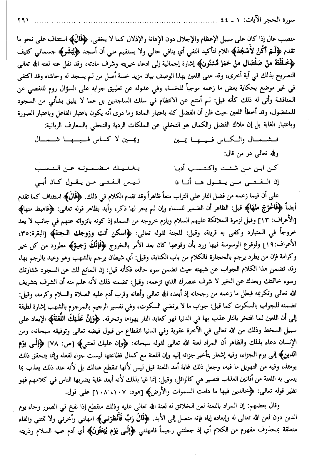 تضمنه للجواب بالسكوت كما قيل: جواب ما لا يرتضي السكوت، وفي تفسير الرجيم بالمرجوم بالشهب إشارة لطيفة إلى أن اللعين لما افتخر بالنار عذب بها في الدنيا فهو كعابد النار يهواها وتحرقه. وَإِنَّ عَلَيْكَ اللَّعْنَةَ الإبعاد على سبيل السخط وذلك من الله تعالى في الآخرة عقوبة وفي الدنيا انقطاع من قبول فيضه تعالى وتوفيقه سبحانه، ومن الإنسان دعاء بذلك والظاهر أن المراد لعنة الله تعالى لقوله سبحانه: وَإِنَّ عَلَيْكَ لَعْنَتِي [ص: 78] إِلى يَوْمِ الدِّينِ إلى يوم الجزاء، وفيه إشعار بتأخير جزائه إليه وإن اللعنة مع كمال فظاعتها ليست جزاء لفعله وإنما يتحقق ذلك يومئذ، وفيه من التهويل ما فيه، وجعل ذلك غاية أمد اللعنة قيل ليس لأنها تنقطع هنالك بل لأنه عند ذلك يعذب بما ينسى به اللعنة من أفانين العذاب فتصير هي كالزائل، وقيل: إنما غيا بذلك لأنه أبعد غاية يضربها الناس في كلامهم فهو نظير قوله تعالى: خالِدِينَ فِيها ما دامَتِ السَّماواتُ وَالْأَرْضُ [هود: 107، 108] على قول.
