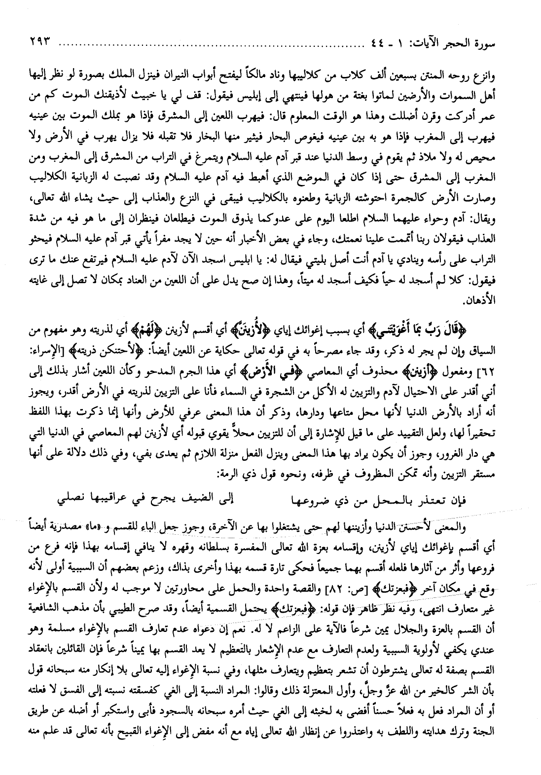 والمعنى لأحسنن الدنيا وأزيننها لهم حتى يشتغلوا بها عن الآخرة، وجوز جعل الباء للقسم و «ما» مصدرية أيضا أي أقسم بإغوائك إياي لأزينن، وإقسامه بعزة الله تعالى المفسرة بسلطانه وقهره لا ينافي إقسامه بهذا فإنه فرع من فروعها وأثر من آثارها فلعله أقسم بهما جميعا فحكى تارة قسمه بهذا وأخرى بذاك، وزعم بعضهم أن السببية أولى لأنه وقع في مكان آخر فَبِعِزَّتِكَ [ص: 82] والقصة واحدة والحمل على محاورتين لا موجب له ولأن القسم بالإغواء غير متعارف انتهى، وفيه نظر ظاهر فإن قوله: فَبِعِزَّتِكَ يحتمل القسمية أيضا، وقد صرح الطيبي بأن مذهب الشافعية أن القسم بالعزة والجلال يمين شرعا فالآية على الزاعم لا له. نعم إن دعواه عدم تعارف القسم بالإغواء مسلمة وهو عندي يكفي لأولوية السببية ولعدم التعارف مع عدم الإشعار بالتعظيم لا يعد القسم بها يمينا شرعا فإن القائلين بانعقاد القسم بصفة له تعالى يشترطون أن تشعر بتعظيم ويتعارف مثلها، وفي نسبة الإغواء إليه تعالى بلا إنكار منه سبحانه قول بأن الشر كالخير من الله عزّ وجلّ، وأول المعتزلة ذلك وقالوا: المراد النسبة إلى الغي كفسقته نسبته إلى الفسق لا فعلته أو أن المراد فعل به فعلا حسنا أفضى به لخبثه إلى الغي حيث أمره سبحانه بالسجود فأبى واستكبر أو أضله عن طريق الجنة وترك هدايته واللطف به واعتذروا عن إنظار الله تعالى إياه مع أنه مفض إلى الإغواء القبيح بأنه تعالى قد علم منه