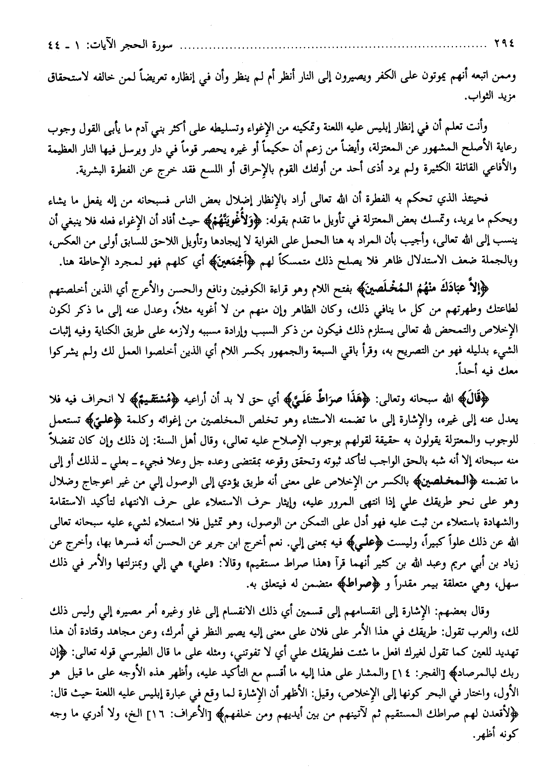 وقال بعضهم: الإشارة إلى انقسامهم إلى قسمين أي ذلك الانقسام إلى غاو وغيره أمر مصيره إلي وليس ذلك لك، والعرب تقول: طريقك في هذا الأمر على فلان على معنى إليه يصير النظر في أمرك، وعن مجاهد وقتادة أن هذا تهديد للعين كما تقول لغيرك افعل ما شئت فطريقك علي أي لا تفوتني، ومثله على ما قال الطبرسي قوله تعالى: إِنَّ رَبَّكَ لَبِالْمِرْصادِ [الفجر: 14] والمشار على هذا إليه ما أقسم مع التأكيد عليه، وأظهر هذه الأوجه على ما قيل هو الأول، واختار في البحر كونها إلى الإخلاص، وقيل: الأظهر أن الإشارة لما وقع في عبارة إبليس عليه اللعنة حيث قال:
